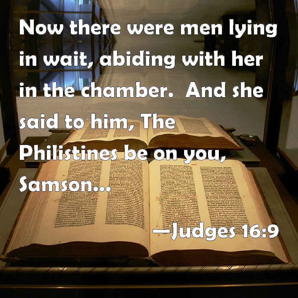 Choose a Background Judges 16:9 Now there were men lying in wait, abiding with her in the chamber. And she said to him, The Philistines be on you, Samson. And he broke the thongs, as a thread of wick is broken when it touches the fire. So his strength was not known. KJV: Now there were men lying in wait, abiding with her in the chamber. And she said unto him, The Philistines be upon thee, Samson. And he brake the withs, as a thread of tow is broken when it toucheth the fire. So his strength was not known. DRB: Men lying privately in wait with her, and in the chamber expecting the event of the thing, and she cried out to him: The Philistines are upon thee, Samson. And he broke the bands, as a man would break a thread of tow twined with spittle, when it smelleth the fire: so it was not known wherein his strength Jay. DBT: Now she had men lying in wait in an inner chamber. And she said to him, "The Philistines are upon you, Samson!" But he snapped the bowstrings, as a string of tow snaps when it touches the fire. So the secret of his strength was not known. ERV: Now she had liers in wait abiding in the inner chamber. And she said unto him, The Philistines be upon thee, Samson. And he brake the withes, as a string of tow is broken when it toucheth the fire. So his strength was not known. WBT: (Now there were men lying in wait, abiding with her in the chamber.) And she said to him, The Philistines are upon thee, Samson. And he broke the withs as a thread of tow is broken when it toucheth the fire. So his strength was not known. WEB: Now she had an ambush waiting in the inner room. She said to him, "The Philistines are on you, Samson!" He broke the cords, as a string of tow is broken when it touches the fire. So his strength was not known. YLT: And the ambush is abiding with her in an inner chamber, and she saith unto him, 'Philistines are upon thee, Samson;' and he breaketh the withs as a thread of tow is broken in its smelling fire, and his power hath not been known.Links Judges 16:9 NIV • Judges 16:9 NLT • Judges 16:9 ESV • Judges 16:9 NASB • Judges 16:9 KJV • Judges 16:9 Interlinear • Judges 16:9 Commentaries • Judges 16:9 Parallel Texts • Judges 16:9 Bible Apps • Judges 16:9 Parallel • Bible Hub |