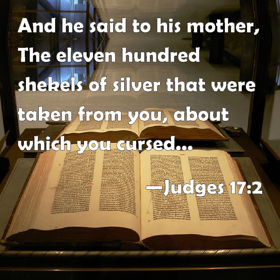 Choose a Background Judges 17:2 And he said to his mother, The eleven hundred shekels of silver that were taken from you, about which you cursed, and spoke of also in my ears, behold, the silver is with me; I took it. And his mother said, Blessed be you of the LORD, my son. KJV: And he said unto his mother, The eleven hundred shekels of silver that were taken from thee, about which thou cursedst, and spakest of also in mine ears, behold, the silver is with me; I took it. And his mother said, Blessed be thou of the LORD, my son. DRB: Who said to his mother: The eleven hundred pieces of silver, which thou hadst put aside for thyself, and concerning which thou didst swear in my hearing, behold I have, and they are with me. And she said to him: Blessed be my son by the Lord. DBT: And he said to his mother, "The eleven hundred pieces of silver which were taken from you, about which you uttered a curse, and also spoke it in my ears, behold, the silver is with me; I took it." And his mother said, "Blessed be my son by the LORD." ERV: And he said unto his mother, The eleven hundred pieces of silver that were taken from thee, about which thou didst utter a curse, and didst also speak it in mine ears, behold, the silver is with me; I took it. And his mother said, Blessed be my son of the LORD. WBT: And he said to his mother, The eleven hundred shekels of silver that were taken from thee, about which thou didst curse, and speak of also in my ears, behold, the silver is with me; I took it. And his mother said, Blessed be thou of the LORD, my son. WEB: He said to his mother, "The eleven hundred [pieces] of silver that were taken from you, about which you uttered a curse, and also spoke it in my ears, behold, the silver is with me; I took it." His mother said, "Blessed be my son of Yahweh." YLT: and he saith to his mother, 'The eleven hundred silverlings which have been taken of thine, and of which thou hast sworn, and also spoken in mine ears; lo, the silver is with me, I have taken it;' and his mother saith, 'Blessed is my son of Jehovah.'Links Judges 17:2 NIV • Judges 17:2 NLT • Judges 17:2 ESV • Judges 17:2 NASB • Judges 17:2 KJV • Judges 17:2 Interlinear • Judges 17:2 Commentaries • Judges 17:2 Parallel Texts • Judges 17:2 Bible Apps • Judges 17:2 Parallel • Bible Hub |