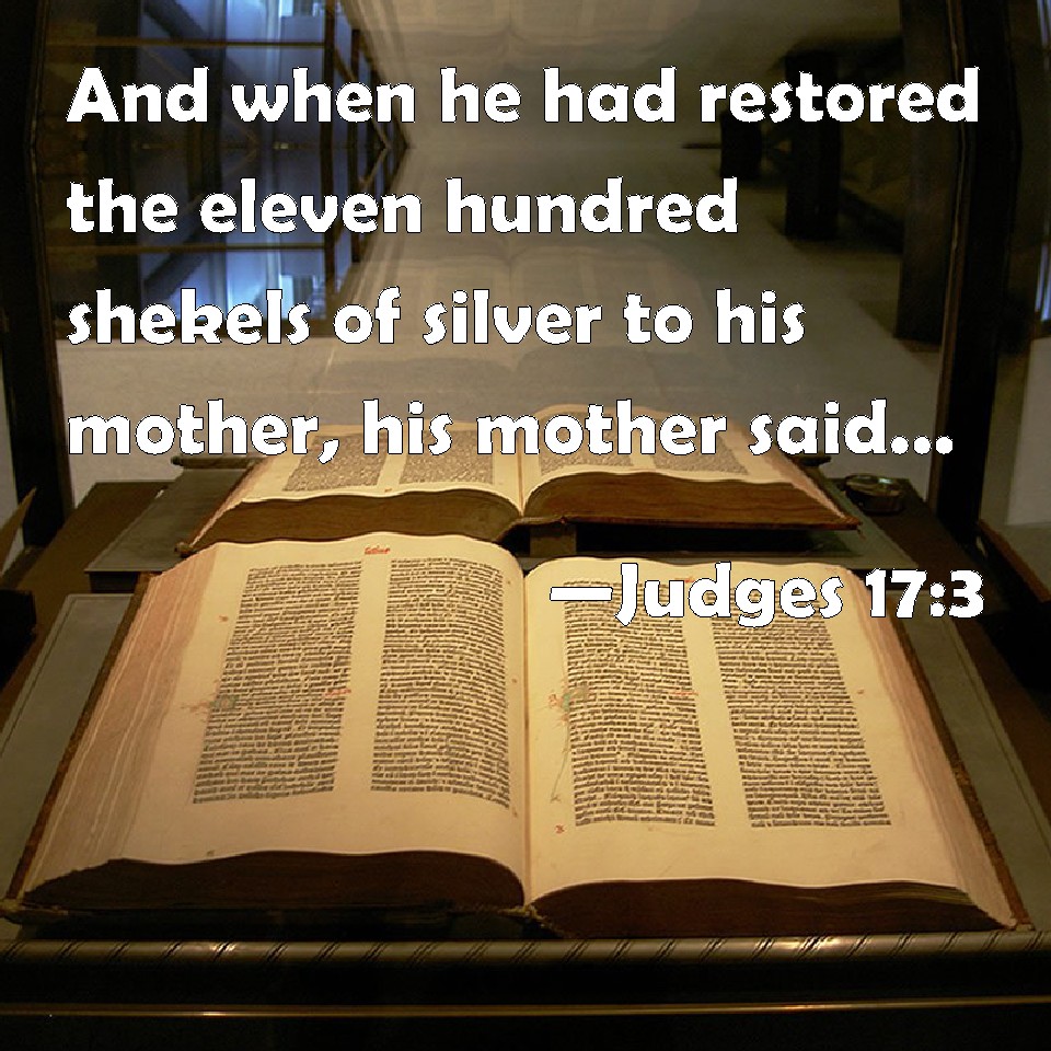 Choose a Background Judges 17:3 And when he had restored the eleven hundred shekels of silver to his mother, his mother said, I had wholly dedicated the silver to the LORD from my hand for my son, to make a graven image and a molten image: now therefore I will restore it to you. KJV: And when he had restored the eleven hundred shekels of silver to his mother, his mother said, I had wholly dedicated the silver unto the LORD from my hand for my son, to make a graven image and a molten image: now therefore I will restore it unto thee. DRB: So he restored them to his mother, who said to him: I have consecrated and vowed this silver to the Lord, that my son may receive it at my hand, and make a graven and a molten god, so now I deliver it to thee. DBT: And he restored the eleven hundred pieces of silver to his mother; and his mother said, "I consecrate the silver to the LORD from my hand for my son, to make a graven image and a molten image; now therefore I will restore it to you." ERV: And he restored the eleven hundred pieces of silver to his mother, and his mother said, I verily dedicate the silver unto the LORD from my hand for my son, to make a graven image and a molten image: now therefore I will restore it unto thee. WBT: And when he had restored the eleven hundred shekels of silver to his mother, his mother said, I had wholly dedicated the silver to the LORD from my hand for my son, to make a graven image and a molten image: now therefore I will restore it to thee. WEB: He restored the eleven hundred [pieces] of silver to his mother; and his mother said, "I most certainly dedicate the silver to Yahweh from my hand for my son, to make an engraved image and a molten image. Now therefore I will restore it to you." YLT: And he giveth back the eleven hundred silverlings to his mother, and his mother saith, 'I had certainly sanctified the silver to Jehovah, from my hand, for my son, to make a graven image, and a molten image; and now, I give it back to thee.'Links Judges 17:3 NIV • Judges 17:3 NLT • Judges 17:3 ESV • Judges 17:3 NASB • Judges 17:3 KJV • Judges 17:3 Interlinear • Judges 17:3 Commentaries • Judges 17:3 Parallel Texts • Judges 17:3 Bible Apps • Judges 17:3 Parallel • Bible Hub |