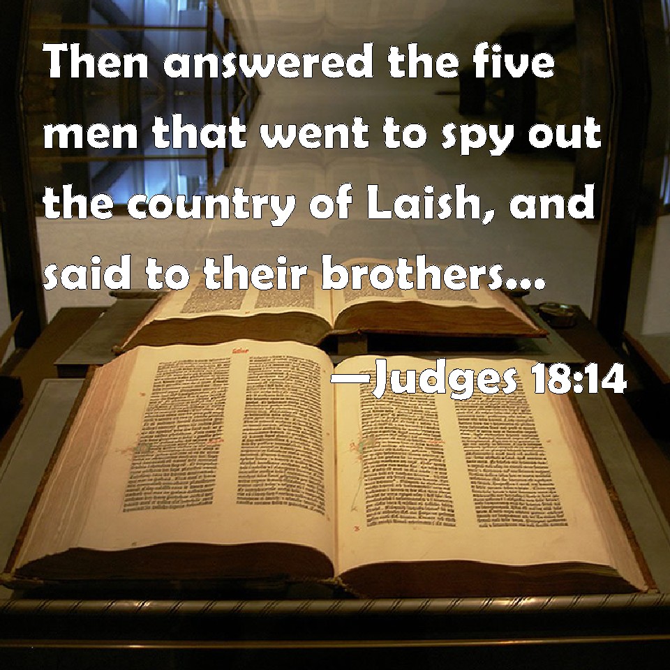 Choose a Background Judges 18:14 Then answered the five men that went to spy out the country of Laish, and said to their brothers, Do you know that there is in these houses an ephod, and teraphim, and a graven image, and a molten image? now therefore consider what you have to do. KJV: Then answered the five men that went to spy out the country of Laish, and said unto their brethren, Do ye know that there is in these houses an ephod, and teraphim, and a graven image, and a molten image? now therefore consider what ye have to do. DRB: The five men, that before had been sent to view the land of Lais, said to the rest of their brethren: You know that in these houses there is an ephod, and theraphim, and a graven, and a molten god: see what you are pleased to do. DBT: Then the five men who had gone to spy out the country of La'ish said to their brethren, "Do you know that in these houses there are an ephod, teraphim, a graven image, and a molten image? Now therefore consider what you will do." ERV: Then answered the five men that went to spy out the country of Laish, and said unto their brethren, Do ye know that there is in these houses an ephod, and teraphim, and a graven image, and a molten image? now therefore consider what ye have to do. WBT: Then answered the five men that went to explore the country of Laish, and said to their brethren, Do ye know that there is in these houses an ephod, and teraphim, and a graven image, and a molten image? now therefore consider what ye have to do. WEB: Then the five men who went to spy out the country of Laish answered, and said to their brothers, "Do you know that there is in these houses an ephod, and teraphim, and an engraved image, and a molten image? Now therefore consider what you have to do." YLT: And the five men, those going to traverse the land of Laish, answer and say unto their brethren, 'Have ye known that there is in these houses an ephod, and teraphim, and graven image, and molten image? and now, know what ye do.'Links Judges 18:14 NIV • Judges 18:14 NLT • Judges 18:14 ESV • Judges 18:14 NASB • Judges 18:14 KJV • Judges 18:14 Interlinear • Judges 18:14 Commentaries • Judges 18:14 Parallel Texts • Judges 18:14 Bible Apps • Judges 18:14 Parallel • Bible Hub |