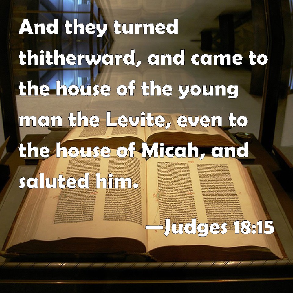 Choose a Background Judges 18:15 And they turned thitherward, and came to the house of the young man the Levite, even to the house of Micah, and saluted him. KJV: And they turned thitherward, and came to the house of the young man the Levite, even unto the house of Micah, and saluted him. DRB: And when they had turned a little aside, they went into the house of the young man the Levite, who was in the house of Michas: and they saluted him with words of peace. DBT: And they turned aside thither, and came to the house of the young Levite, at the home of Micah, and asked him of his welfare. ERV: And they turned aside thither, and came to the house of the young man the Levite, even unto the house of Micah, and asked him of his welfare. WBT: And they turned thitherward, and came to the house of the young man the Levite, even to the house of Micah, and saluted him. WEB: They turned aside there, and came to the house of the young man the Levite, even to the house of Micah, and asked him of his welfare. YLT: And they turn aside thither, and come in unto the house of the young man the Levite, the house of Micah, and ask of him of welfare, — Links Judges 18:15 NIV • Judges 18:15 NLT • Judges 18:15 ESV • Judges 18:15 NASB • Judges 18:15 KJV • Judges 18:15 Interlinear • Judges 18:15 Commentaries • Judges 18:15 Parallel Texts • Judges 18:15 Bible Apps • Judges 18:15 Parallel • Bible Hub |