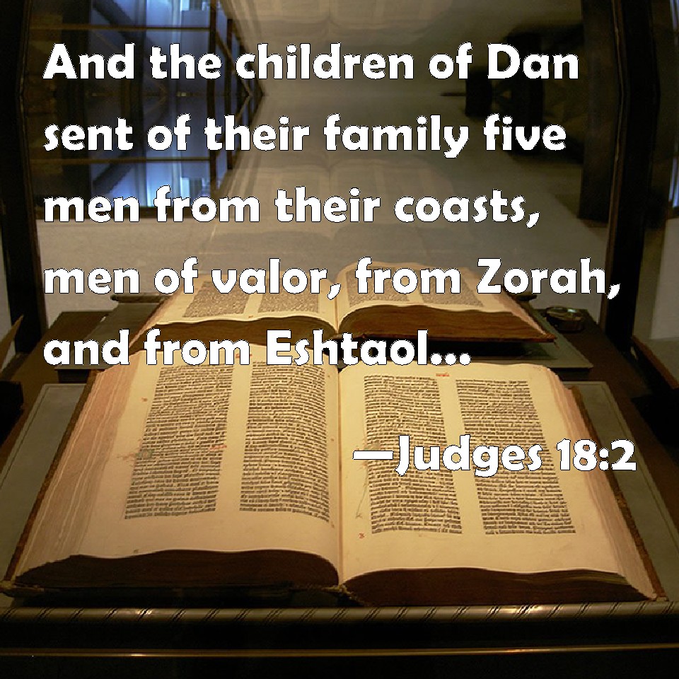 Choose a Background Judges 18:2 And the children of Dan sent of their family five men from their coasts, men of valor, from Zorah, and from Eshtaol, to spy out the land, and to search it; and they said to them, Go, search the land: who when they came to mount Ephraim, to the house of Micah, they lodged there. KJV: And the children of Dan sent of their family five men from their coasts, men of valour, from Zorah, and from Eshtaol, to spy out the land, and to search it; and they said unto them, Go, search the land: who when they came to mount Ephraim, to the house of Micah, they lodged there. DRB: So the children of Dan sent five most valiant men of their stock and family from Saraa and Esthaol, to spy out the land, and to view it diligently: and they said to them: Go, and view the land. They went on their way, and when they came to mount Ephraim, they went into the house of Michas, and rested there: DBT: So the Danites sent five able men from the whole number of their tribe, from Zorah and from Esh'ta-ol, to spy out the land and to explore it; and they said to them, "Go and explore the land." And they came to the hill country of E'phraim, to the house of Micah, and lodged there. ERV: And the children of Dan sent of their family five men from their whole number, men of valour, from Zorah, and from Eshtaol, to spy out the land, and to search it; and they said unto them, Go, search the land: and they came to the hill country of Ephraim, unto the house of Micah, and lodged there. WBT: And the children of Dan sent of their family five men from their borders, men of valor, from Zorah, and from Eshtaol, to explore the land, and to search it; and they said to them, Go, search the land: who when they came to mount Ephraim, to the house of Micah, they lodged there. WEB: The children of Dan sent of their family five men from their whole number, men of valor, from Zorah, and from Eshtaol, to spy out the land, and to search it; and they said to them, "Go, explore the land!" They came to the hill country of Ephraim, to the house of Micah, and lodged there. YLT: And the sons of Dan send, out of their family, five men of them, men, sons of valour, from Zorah, and from Eshtaol, to traverse the land, and to search it, and they say unto them, 'Go, search the land;' and they come into the hill-country of Ephraim, unto the house of Micah, and lodge there.Links Judges 18:2 NIV • Judges 18:2 NLT • Judges 18:2 ESV • Judges 18:2 NASB • Judges 18:2 KJV • Judges 18:2 Interlinear • Judges 18:2 Commentaries • Judges 18:2 Parallel Texts • Judges 18:2 Bible Apps • Judges 18:2 Parallel • Bible Hub |
