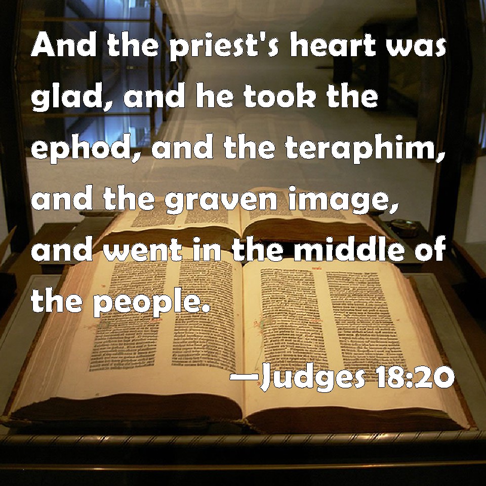 Choose a Background Judges 18:20 And the priest's heart was glad, and he took the ephod, and the teraphim, and the graven image, and went in the middle of the people. KJV: And the priest's heart was glad, and he took the ephod, and the teraphim, and the graven image, and went in the midst of the people. DRB: When he had heard this, he agreed to their words, and took the ephod, and the idols, and the graven god, and departed with them. DBT: And the priest's heart was glad; he took the ephod, and the teraphim, and the graven image, and went in the midst of the people. ERV: And the priest's heart was glad, and he took the ephod, and the teraphim, and the graven image, and went in the midst of the people. WBT: And the priest's heart was glad, and he took the ephod, and the teraphim, and the graven image, and went in the midst of the people. WEB: The priest's heart was glad, and he took the ephod, and the teraphim, and the engraved image, and went in the midst of the people. YLT: And the heart of the priest is glad, and he taketh the ephod, and the teraphim, and the graven image, and goeth into the midst of the people,Links Judges 18:20 NIV • Judges 18:20 NLT • Judges 18:20 ESV • Judges 18:20 NASB • Judges 18:20 KJV • Judges 18:20 Interlinear • Judges 18:20 Commentaries • Judges 18:20 Parallel Texts • Judges 18:20 Bible Apps • Judges 18:20 Parallel • Bible Hub |