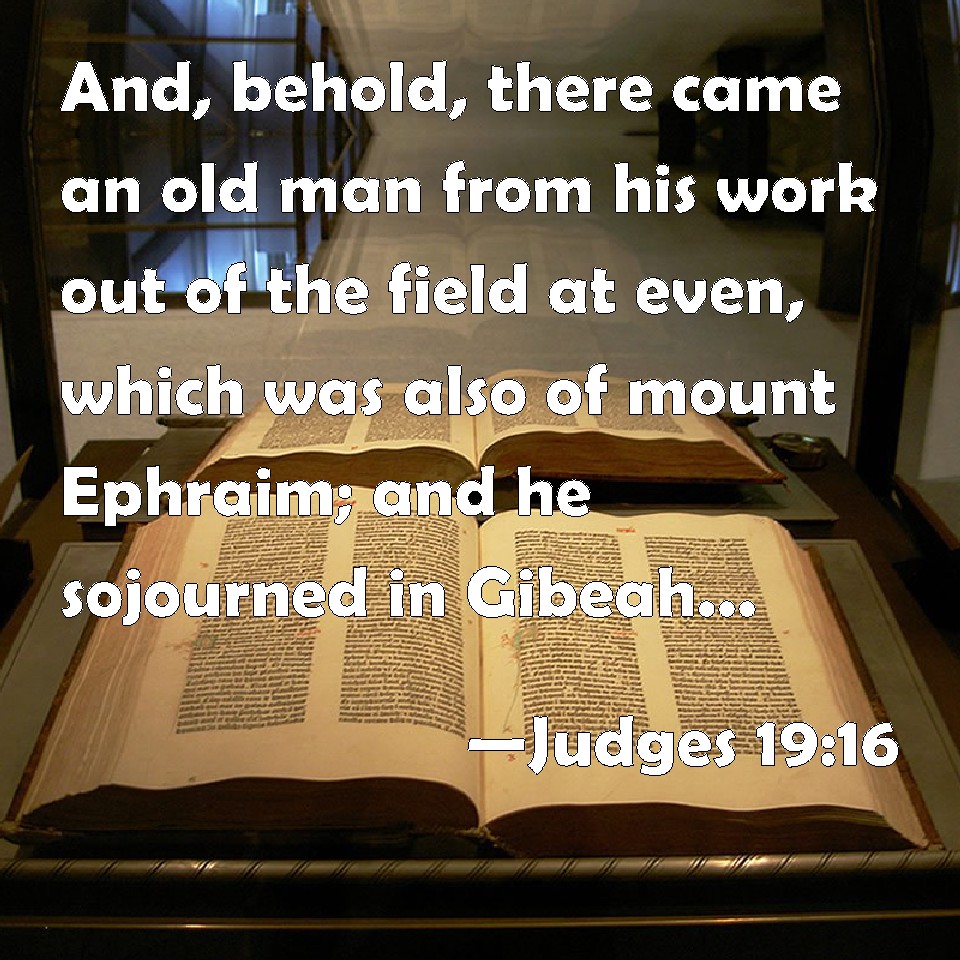 Choose a Background Judges 19:16 And, behold, there came an old man from his work out of the field at even, which was also of mount Ephraim; and he sojourned in Gibeah: but the men of the place were Benjamites. KJV: And, behold, there came an old man from his work out of the field at even, which was also of mount Ephraim; and he sojourned in Gibeah: but the men of the place were Benjamites. DRB: And behold they saw an old man, returning out of the field and from his work in the evening, and he also was of mount Ephraim, and dwelt as a stranger in Gabaa; but the men of that country were the children of Jemini. DBT: And behold, an old man was coming from his work in the field at evening; the man was from the hill country of E'phraim, and he was sojourning in Gib'e-ah; the men of the place were Benjaminites. ERV: And, behold, there came an old man from his work out of the field at even; now the man was of the hill country of Ephraim, and he sojourned in Gibeah: but the men of the place were Benjamites. WBT: And, behold, there came an old man from his work out of the field at evening, who was also of mount Ephraim; and he dwelt in Gibeah: but the men of the place were Benjaminites. WEB: Behold, there came an old man from his work out of the field at evening: now the man was of the hill country of Ephraim, and he lived in Gibeah; but the men of the place were Benjamites. YLT: And lo, a man, an aged one, hath come from his work from the field in the evening, and the man is of the hill-country of Ephraim, and he is a sojourner in Gibeah, and the men of the place are Benjamites.Links Judges 19:16 NIV • Judges 19:16 NLT • Judges 19:16 ESV • Judges 19:16 NASB • Judges 19:16 KJV • Judges 19:16 Interlinear • Judges 19:16 Commentaries • Judges 19:16 Parallel Texts • Judges 19:16 Bible Apps • Judges 19:16 Parallel • Bible Hub |