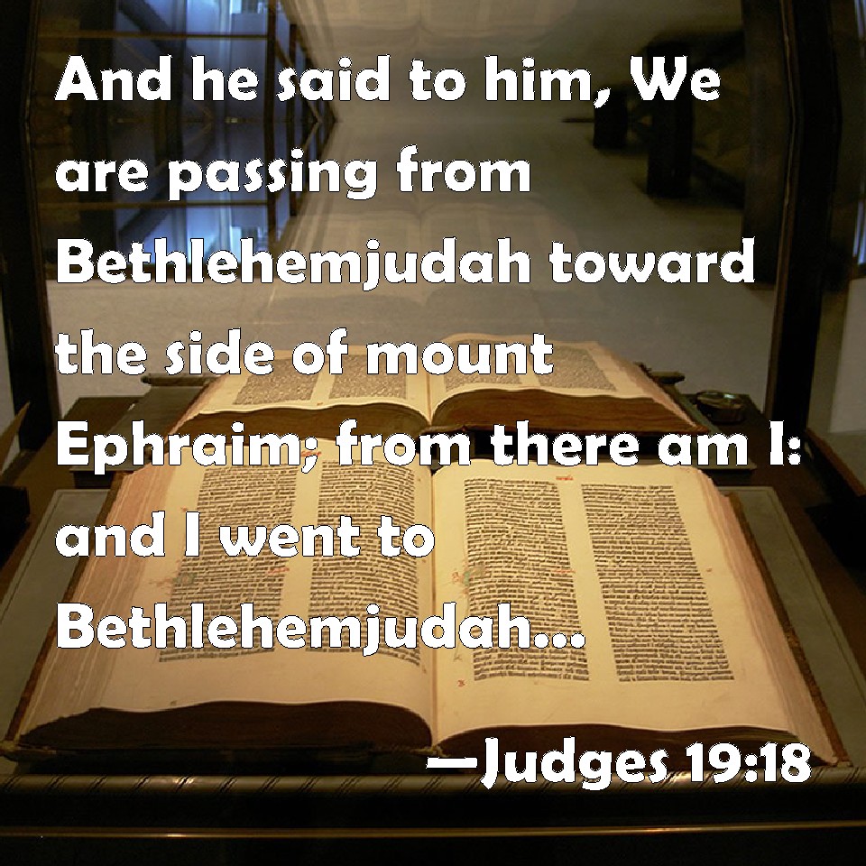 Choose a Background Judges 19:18 And he said to him, We are passing from Bethlehemjudah toward the side of mount Ephraim; from there am I: and I went to Bethlehemjudah, but I am now going to the house of the LORD; and there is no man that receives me to house. KJV: And he said unto him, We are passing from Bethlehemjudah toward the side of mount Ephraim; from thence am I: and I went to Bethlehemjudah, but I am now going to the house of the LORD; and there is no man that receiveth me to house. DRB: He answered him: We came out from Bethlehem Juda, and we are going to our home, which is on the side of mount Ephraim, from whence we went to Bethlehem: and now we go to the house of God, and none will receive us under his roof: DBT: And he said to him, "We are passing from Bethlehem in Judah to the remote parts of the hill country of E'phraim, from which I come. I went to Bethlehem in Judah; and I am going to my home; and nobody takes me into his house. ERV: And he said unto him, We are passing from Beth-lehem-judah unto the farther side of the hill country of Ephraim; from thence am I, and I went to Beth-lehem-judah: and I am now going to the house of the LORD; and there is no man that taketh me into his house. WBT: And he said to him, We are passing from Beth-lehem-Judah towards the side of mount Ephraim; from thence am I: and I went to Beth-lehem-judah, but I am now going to the house of the LORD; and there is no man that receiveth me into his house. WEB: He said to him, "We are passing from Bethlehem Judah to the farther side of the hill country of Ephraim. I am from there, and I went to Bethlehem Judah. I am going to the house of Yahweh; and there is no man who takes me into his house. YLT: And he saith unto him, 'We are passing over from Beth-Lehem-Judah unto the sides of the hill-country of Ephraim — thence I am, and I go unto Beth-Lehem-Judah; and to the house of Jehovah I am going, and there is no man gathering me into the house,Links Judges 19:18 NIV • Judges 19:18 NLT • Judges 19:18 ESV • Judges 19:18 NASB • Judges 19:18 KJV • Judges 19:18 Interlinear • Judges 19:18 Commentaries • Judges 19:18 Parallel Texts • Judges 19:18 Bible Apps • Judges 19:18 Parallel • Bible Hub |