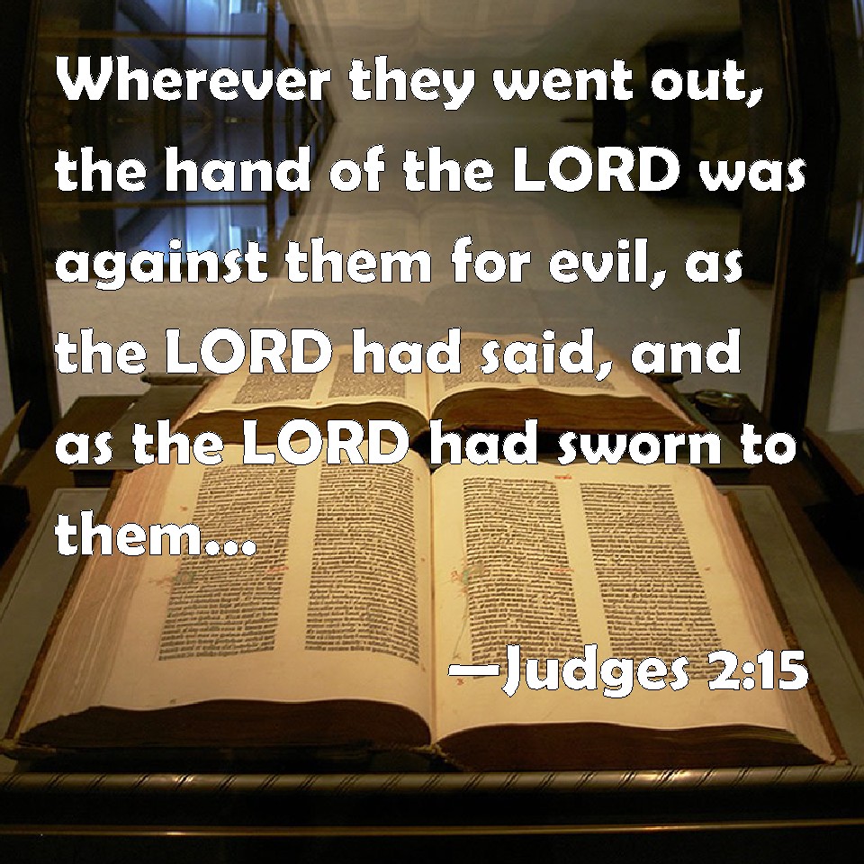 Choose a Background Judges 2:15 Wherever they went out, the hand of the LORD was against them for evil, as the LORD had said, and as the LORD had sworn to them: and they were greatly distressed. KJV: Whithersoever they went out, the hand of the LORD was against them for evil, as the LORD had said, and as the LORD had sworn unto them: and they were greatly distressed. DRB: But whithersoever they meant to go, the hand of the Lord was upon them, as he had said, and as he had sworn to them: and they were greatly distressed. DBT: Whenever they marched out, the hand of the LORD was against them for evil, as the LORD had warned, and as the LORD had sworn to them; and they were in sore straits. ERV: Whithersoever they went out, the hand of the LORD was against them for evil, as the LORD had spoken, and as the LORD had sworn unto them: and they were sore distressed. WBT: Whithersoever they went out, the hand of the LORD was against them for evil, as the LORD had said, and as the LORD had sworn to them: and they were greatly distressed. WEB: Wherever they went out, the hand of Yahweh was against them for evil, as Yahweh had spoken, and as Yahweh had sworn to them: and they were very distressed. YLT: in every place where they have gone out, the hand of Jehovah hath been against them for evil, as Jehovah hath spoken, and as Jehovah hath sworn to them, and they are distressed — greatly.Links Judges 2:15 NIV • Judges 2:15 NLT • Judges 2:15 ESV • Judges 2:15 NASB • Judges 2:15 KJV • Judges 2:15 Interlinear • Judges 2:15 Commentaries • Judges 2:15 Parallel Texts • Judges 2:15 Bible Apps • Judges 2:15 Parallel • Bible Hub |