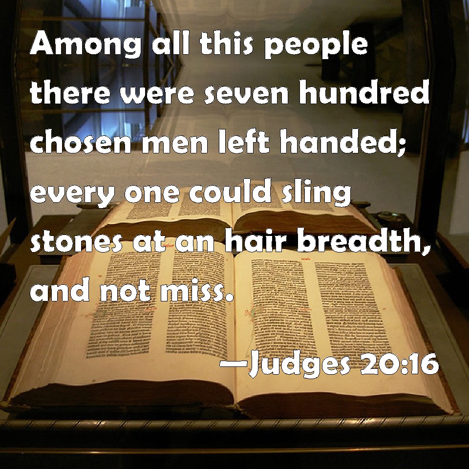 Choose a Background Judges 20:16 Among all this people there were seven hundred chosen men left handed; every one could sling stones at an hair breadth, and not miss. KJV: Among all this people there were seven hundred chosen men lefthanded; every one could sling stones at an hair breadth, and not miss. DRB: Who were seven hundred most valiant men, fighting with the left hand as well as with the right: and slinging stones so sure that they could hit even a hair, and not miss by the stone's going on either side. DBT: Among all these were seven hundred picked men who were left-handed; every one could sling a stone at a hair, and not miss. ERV: Among all this people there were seven hundred chosen men lefthanded; every one could sling stones at an hair-breadth, and not miss. WBT: Among all this people there were seven hundred chosen men left-handed; every one could sling stones to a hair-breadth, and not miss. WEB: Among all this people there were seven hundred chosen men left-handed; everyone could sling stones at a hair-breadth, and not miss. YLT: among all this people are seven hundred chosen men, bound of their right hand, each of these slinging with a stone at the hair, and he doth not err.Links Judges 20:16 NIV • Judges 20:16 NLT • Judges 20:16 ESV • Judges 20:16 NASB • Judges 20:16 KJV • Judges 20:16 Interlinear • Judges 20:16 Commentaries • Judges 20:16 Parallel Texts • Judges 20:16 Bible Apps • Judges 20:16 Parallel • Bible Hub |