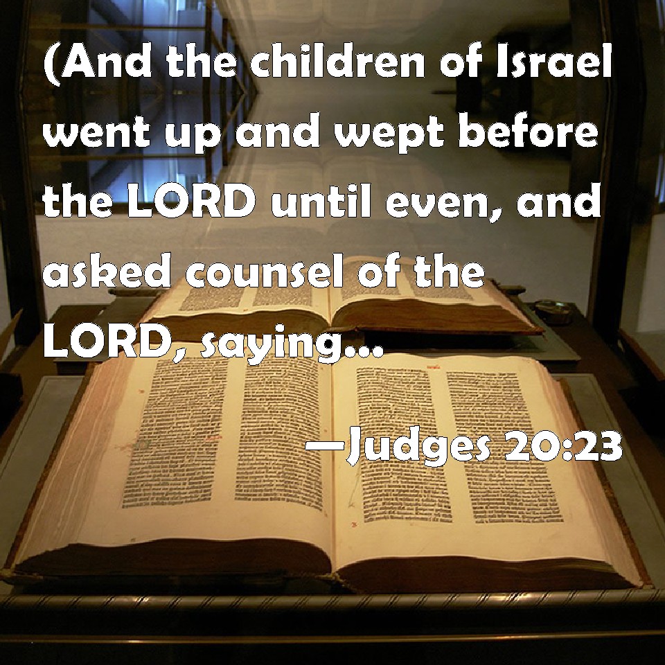 Choose a Background Judges 20:23 (And the children of Israel went up and wept before the LORD until even, and asked counsel of the LORD, saying, Shall I go up again to battle against the children of Benjamin my brother? And the LORD said, Go up against him.) KJV: (And the children of Israel went up and wept before the LORD until even, and asked counsel of the LORD, saying, Shall I go up again to battle against the children of Benjamin my brother? And the LORD said, Go up against him.) DRB: Yet so that they first went up and wept before the Lord until night: and consulted him, and said: Shall I go out any more to fight against the children of Benjamin my brethren, or not? And he answered them: Go up against them, and join battle. DBT: And the people of Israel went up and wept before the LORD until the evening; and they inquired of the LORD, "Shall we again draw near to battle against our brethren the Benjaminites?" And the LORD said, "Go up against them." ERV: (And the children of Israel went up and wept before the LORD until even; and they asked of the LORD, saying, Shall I again draw nigh to battle against the children of Benjamin my brother? And the LORD said, Go up against him.) WBT: (And the children of Israel went up and wept before the LORD until evening, and asked counsel of the LORD, saying, Shall I go up again to battle against the children of Benjamin my brother? And the LORD said, Go up against him.) WEB: The children of Israel went up and wept before Yahweh until evening; and they asked of Yahweh, saying, "Shall I again draw near to battle against the children of Benjamin my brother?" Yahweh said, "Go up against him." YLT: And the sons of Israel go up and weep before Jehovah till the evening, and ask of Jehovah, saying, 'Do I add to draw nigh to battle with the sons of Benjamin, my brother?' And Jehovah saith, 'Go up against him.'Links Judges 20:23 NIV • Judges 20:23 NLT • Judges 20:23 ESV • Judges 20:23 NASB • Judges 20:23 KJV • Judges 20:23 Interlinear • Judges 20:23 Commentaries • Judges 20:23 Parallel Texts • Judges 20:23 Bible Apps • Judges 20:23 Parallel • Bible Hub |