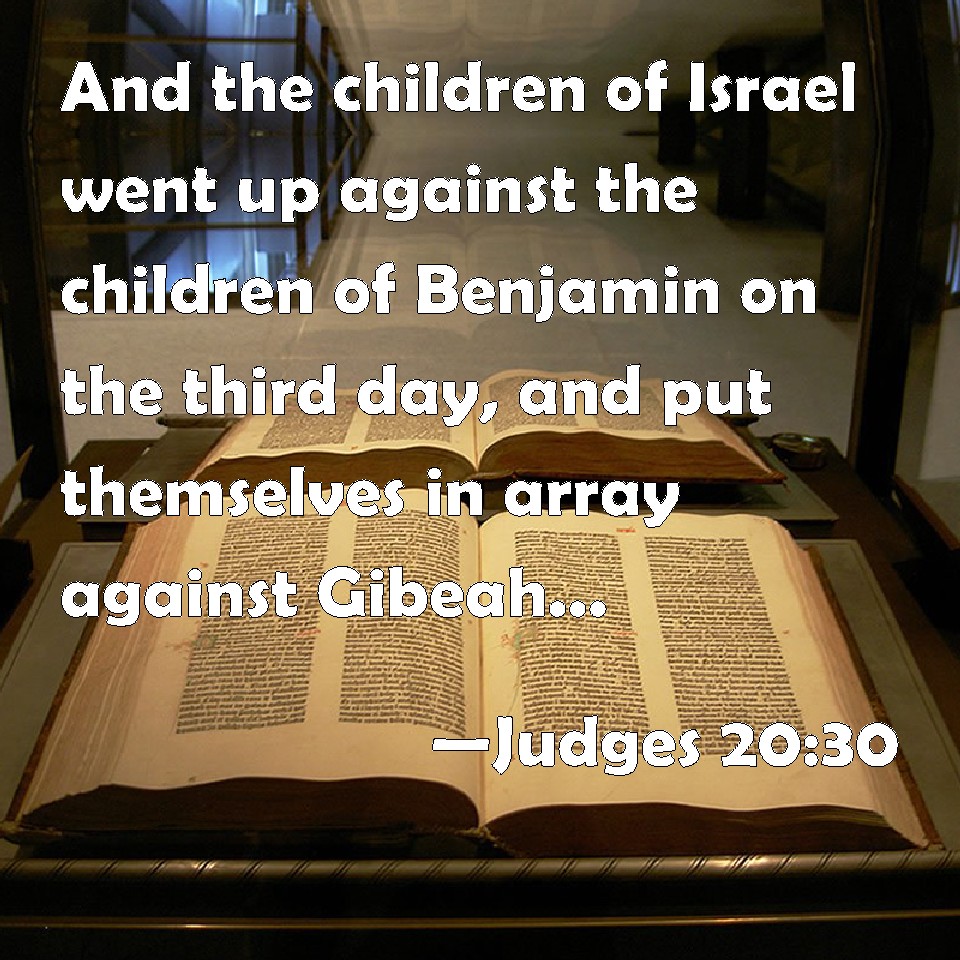 Choose a Background Judges 20:30 And the children of Israel went up against the children of Benjamin on the third day, and put themselves in array against Gibeah, as at other times. KJV: And the children of Israel went up against the children of Benjamin on the third day, and put themselves in array against Gibeah, as at other times. DRB: And they drew up their army against Benjamin the third time, as they had done the first and second. DBT: And the people of Israel went up against the Benjaminites on the third day, and set themselves in array against Gib'e-ah, as at other times. ERV: And the children of Israel went up against the children of Benjamin on the third day, and set themselves in array against Gibeah, as at other times. WBT: And the children of Israel went up against the children of Benjamin on the third day, and put themselves in array against Gibeah, as at other times. WEB: The children of Israel went up against the children of Benjamin on the third day, and set themselves in array against Gibeah, as at other times. YLT: and the sons of Israel go up against the sons of Benjamin, on the third day, and arrange themselves against Gibeah, as time by time.Links Judges 20:30 NIV • Judges 20:30 NLT • Judges 20:30 ESV • Judges 20:30 NASB • Judges 20:30 KJV • Judges 20:30 Interlinear • Judges 20:30 Commentaries • Judges 20:30 Parallel Texts • Judges 20:30 Bible Apps • Judges 20:30 Parallel • Bible Hub |