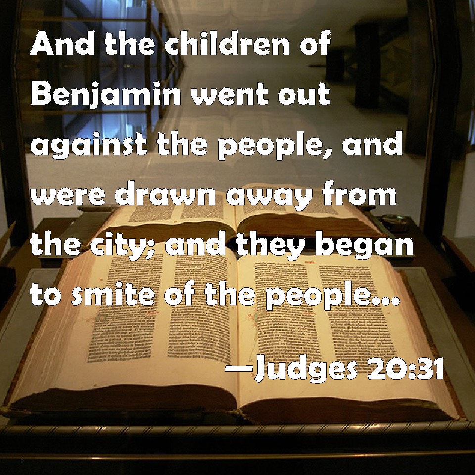 Choose a Background Judges 20:31 And the children of Benjamin went out against the people, and were drawn away from the city; and they began to smite of the people, and kill, as at other times, in the highways, of which one goes up to the house of God, and the other to Gibeah in the field, about thirty men of Israel. KJV: And the children of Benjamin went out against the people, and were drawn away from the city; and they began to smite of the people, and kill, as at other times, in the highways, of which one goeth up to the house of God, and the other to Gibeah in the field, about thirty men of Israel. DRB: And the children of Benjamin boldly issued out of the city, and seeing their enemies flee, pursued them a long way, so as to wound and kill some of them, as they had done the first and second day, whilst they fled by two highways, whereof one goeth up to Bethel, and the other to Gabaa, and they slew about thirty men: DBT: And the Benjaminites went out against the people, and were drawn away from the city; and as at other times they began to smite and kill some of the people, in the highways, one of which goes up to Bethel and the other to Gib'e-ah, and in the open country, about thirty men of Israel. ERV: And the children of Benjamin went out against the people, and were drawn away from the city; and they began to smite and kill of the people, as at other times, in the highways, of which one goeth up to Beth-el, and the other to Gibeah, in the field, about thirty men of Israel. WBT: And the children of Benjamin went out against the people, and were drawn away from the city; and they began to smite of the people, and kill, as at other times, in the highways, of which one goeth up to the house of God, and the other to Gibeah in the field, about thirty men of Israel. WEB: The children of Benjamin went out against the people, and were drawn away from the city; and they began to strike and kill of the people, as at other times, in the highways, of which one goes up to Bethel, and the other to Gibeah, in the field, about thirty men of Israel. YLT: And the sons of Benjamin come out to meet the people; they have been drawn away out of the city, and begin to smite some of the people — wounded as time by time, in the highways (of which one is going up to Beth-El, and the other to Gibeah in the field), are about thirty men of Israel.Links Judges 20:31 NIV • Judges 20:31 NLT • Judges 20:31 ESV • Judges 20:31 NASB • Judges 20:31 KJV • Judges 20:31 Interlinear • Judges 20:31 Commentaries • Judges 20:31 Parallel Texts • Judges 20:31 Bible Apps • Judges 20:31 Parallel • Bible Hub |