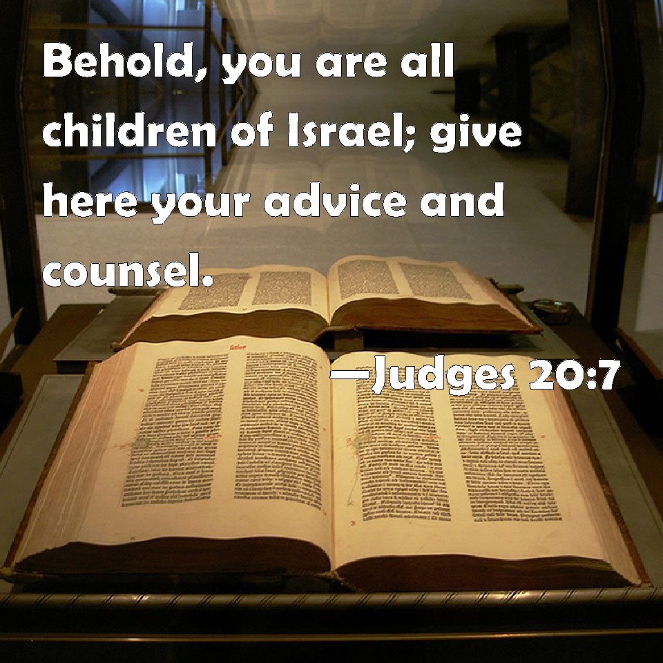 Choose a Background Judges 20:7 Behold, you are all children of Israel; give here your advice and counsel. KJV: Behold, ye are all children of Israel; give here your advice and counsel. DRB: You are all here, O children of Israel, determine what you ought to do. DBT: Behold, you people of Israel, all of you, give your advice and counsel here." ERV: Behold, ye children of Israel, all of you, give here your advice and counsel. WBT: Behold, ye are all children of Israel; give here your advice and counsel. WEB: Behold, you children of Israel, all of you, give here your advice and counsel." YLT: lo, ye are all sons of Israel; give for you a word and counsel here.'Links Judges 20:7 NIV • Judges 20:7 NLT • Judges 20:7 ESV • Judges 20:7 NASB • Judges 20:7 KJV • Judges 20:7 Interlinear • Judges 20:7 Commentaries • Judges 20:7 Parallel Texts • Judges 20:7 Bible Apps • Judges 20:7 Parallel • Bible Hub |
