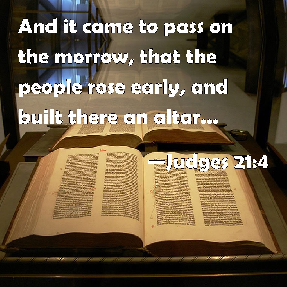 Choose a Background Judges 21:4 And it came to pass on the morrow, that the people rose early, and built there an altar, and offered burnt offerings and peace offerings. KJV: And it came to pass on the morrow, that the people rose early, and built there an altar, and offered burnt offerings and peace offerings. DRB: And rising early the next day, they built an altar: and offered there holocausts, and victims of peace, and they said: DBT: And on the morrow the people rose early, and built there an altar, and offered burnt offerings and peace offerings. ERV: And it came to pass on the morrow, that the people rose early, and built there an altar, and offered burnt offerings and peace offerings. WBT: And it came to pass on the morrow, that the people rose early, and built there an altar, and offered burnt-offerings, and peace-offerings. WEB: It happened on the next day that the people rose early, and built there an altar, and offered burnt offerings and peace offerings. YLT: And it cometh to pass on the morrow, that the people rise early, and build there an altar, and cause to ascend burnt-offerings and peace-offerings.Links Judges 21:4 NIV • Judges 21:4 NLT • Judges 21:4 ESV • Judges 21:4 NASB • Judges 21:4 KJV • Judges 21:4 Interlinear • Judges 21:4 Commentaries • Judges 21:4 Parallel Texts • Judges 21:4 Bible Apps • Judges 21:4 Parallel • Bible Hub |