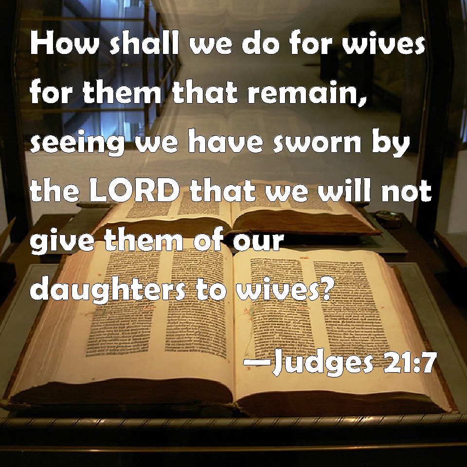 Judges 21:7 How shall we do for wives for them that remain, seeing we have sworn by the LORD that we will not give them of our daughters to wives?