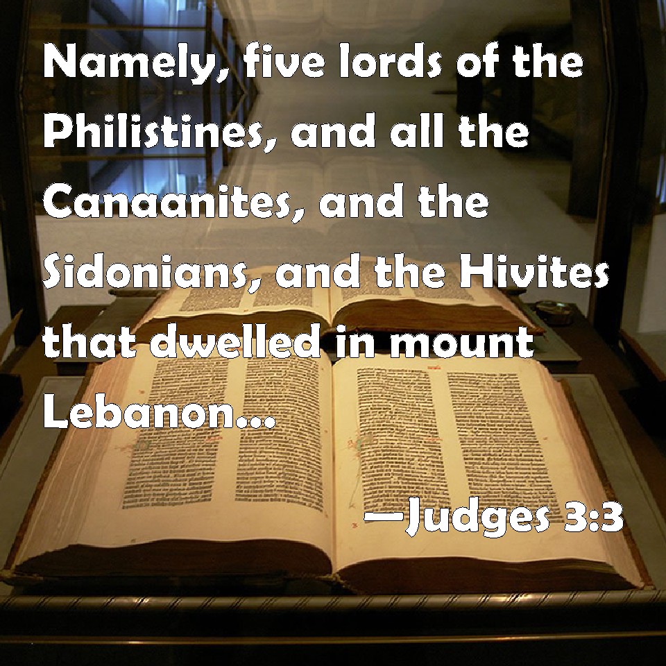 Choose a Background Judges 3:3 Namely, five lords of the Philistines, and all the Canaanites, and the Sidonians, and the Hivites that dwelled in mount Lebanon, from mount Baalhermon to the entering in of Hamath. KJV: Namely, five lords of the Philistines, and all the Canaanites, and the Sidonians, and the Hivites that dwelt in mount Lebanon, from mount Baalhermon unto the entering in of Hamath. DRB: The five princes of the Philistines, and all the Chanaanites, and the Sidonians, and the Hevites that dwelt in mount Libanus, from mount Baal Hermon to the entering into Emath. DBT: These are the nations: the five lords of the Philistines, and all the Canaanites, and the Sido'nians, and the Hivites who dwelt on Mount Lebanon, from Mount Ba'al-her'mon as far as the entrance of Hamath. ERV: namely, the five lords of the Philistines, and all the Canaanites, and the Zidonians, and the Hivites that dwelt in mount Lebanon, from mount Baal-hermon unto the entering in of Hamath. WBT: Namely, five lords of the Philistines, and all the Canaanites, and the Sidonians, and the Hivites that dwelt on mount Lebanon, from mount Baal-hermon to the entrance of Hamath. WEB: [namely], the five lords of the Philistines, and all the Canaanites, and the Sidonians, and the Hivites who lived on Mount Lebanon, from Mount Baal Hermon to the entrance of Hamath. YLT: five princes of the Philistines, and all the Canaanite, and the Zidonian, and the Hivite inhabiting mount Lebanon, from mount Baal-Hermon unto the entering in of Hamath;Links Judges 3:3 NIV • Judges 3:3 NLT • Judges 3:3 ESV • Judges 3:3 NASB • Judges 3:3 KJV • Judges 3:3 Interlinear • Judges 3:3 Commentaries • Judges 3:3 Parallel Texts • Judges 3:3 Bible Apps • Judges 3:3 Parallel • Bible Hub |