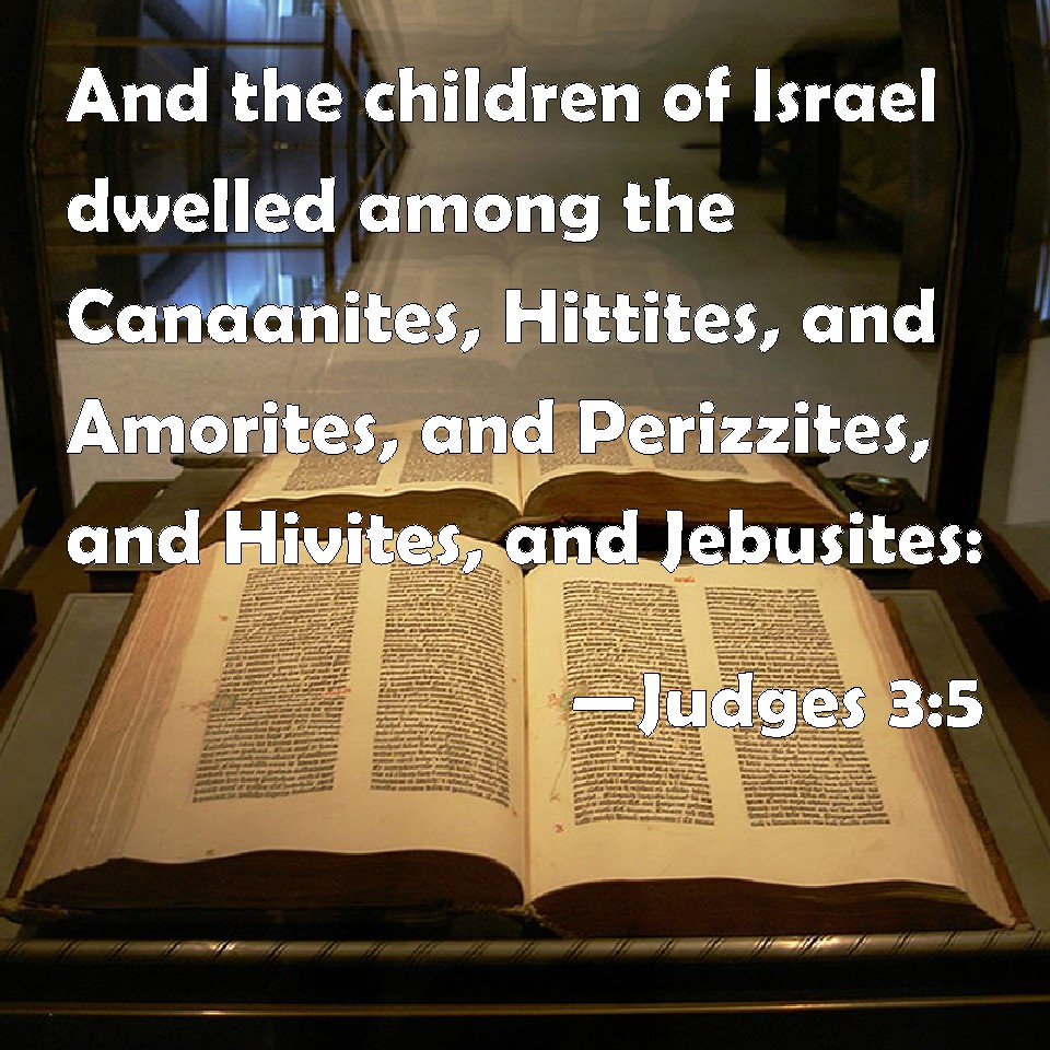 Choose a Background Judges 3:5 And the children of Israel dwelled among the Canaanites, Hittites, and Amorites, and Perizzites, and Hivites, and Jebusites: KJV: And the children of Israel dwelt among the Canaanites, Hittites, and Amorites, and Perizzites, and Hivites, and Jebusites: DRB: So the children of Israel dwelt in the midst of the Chanaanite, and the Hethite, and the Amorrhite, and the Pherezite, and the Hevite, and the Jebusite: DBT: So the people of Israel dwelt among the Canaanites, the Hittites, the Amorites, the Per'izzites, the Hivites, and the Jeb'usites; ERV: And the children of Israel dwelt among the Canaanites; the Hittite, and the Amorite, and the Perizzite, and the Hivite, and the Jebusite: WBT: And the children of Israel dwelt among the Canaanites, Hittites, and Amorites, and Perizzites, and Hivites, and Jebusites: WEB: The children of Israel lived among the Canaanites, the Hittites, and the Amorites, and the Perizzites, and the Hivites, and the Jebusites: YLT: And the sons of Israel have dwelt in the midst of the Canaanite, the Hittite, and the Amorite, and the Perizzite, and the Hivite, and the Jebusite,Links Judges 3:5 NIV • Judges 3:5 NLT • Judges 3:5 ESV • Judges 3:5 NASB • Judges 3:5 KJV • Judges 3:5 Interlinear • Judges 3:5 Commentaries • Judges 3:5 Parallel Texts • Judges 3:5 Bible Apps • Judges 3:5 Parallel • Bible Hub |