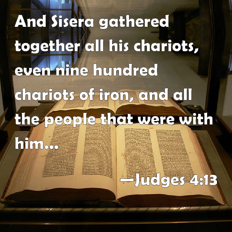 Choose a Background Judges 4:13 And Sisera gathered together all his chariots, even nine hundred chariots of iron, and all the people that were with him, from Harosheth of the Gentiles to the river of Kishon. KJV: And Sisera gathered together all his chariots, even nine hundred chariots of iron, and all the people that were with him, from Harosheth of the Gentiles unto the river of Kishon. DRB: And he gathered together his nine hundred chariots armed with scythes, and all his army from Haroseth of the Gentiles to the torrent Cison. DBT: Sis'era called out all his chariots, nine hundred chariots of iron, and all the men who were with him, from Haro'sheth-ha-goiim to the river Kishon. ERV: And Sisera gathered together all his chariots, even nine hundred chariots of iron, and all the people that were with him, from Harosheth of the Gentiles, unto the river Kishon. WBT: And Sisera collected all his chariots, even nine hundred chariots of iron, and all the people that were with him, from Harosheth of the Gentiles to the river of Kishon. WEB: Sisera gathered together all his chariots, even nine hundred chariots of iron, and all the people who were with him, from Harosheth of the Gentiles, to the river Kishon. YLT: and Sisera calleth all his chariots, nine hundred chariots of iron, and all the people who are with him, from Harosheth of the Goyim, unto the brook Kishon.Links Judges 4:13 NIV • Judges 4:13 NLT • Judges 4:13 ESV • Judges 4:13 NASB • Judges 4:13 KJV • Judges 4:13 Interlinear • Judges 4:13 Commentaries • Judges 4:13 Parallel Texts • Judges 4:13 Bible Apps • Judges 4:13 Parallel • Bible Hub |