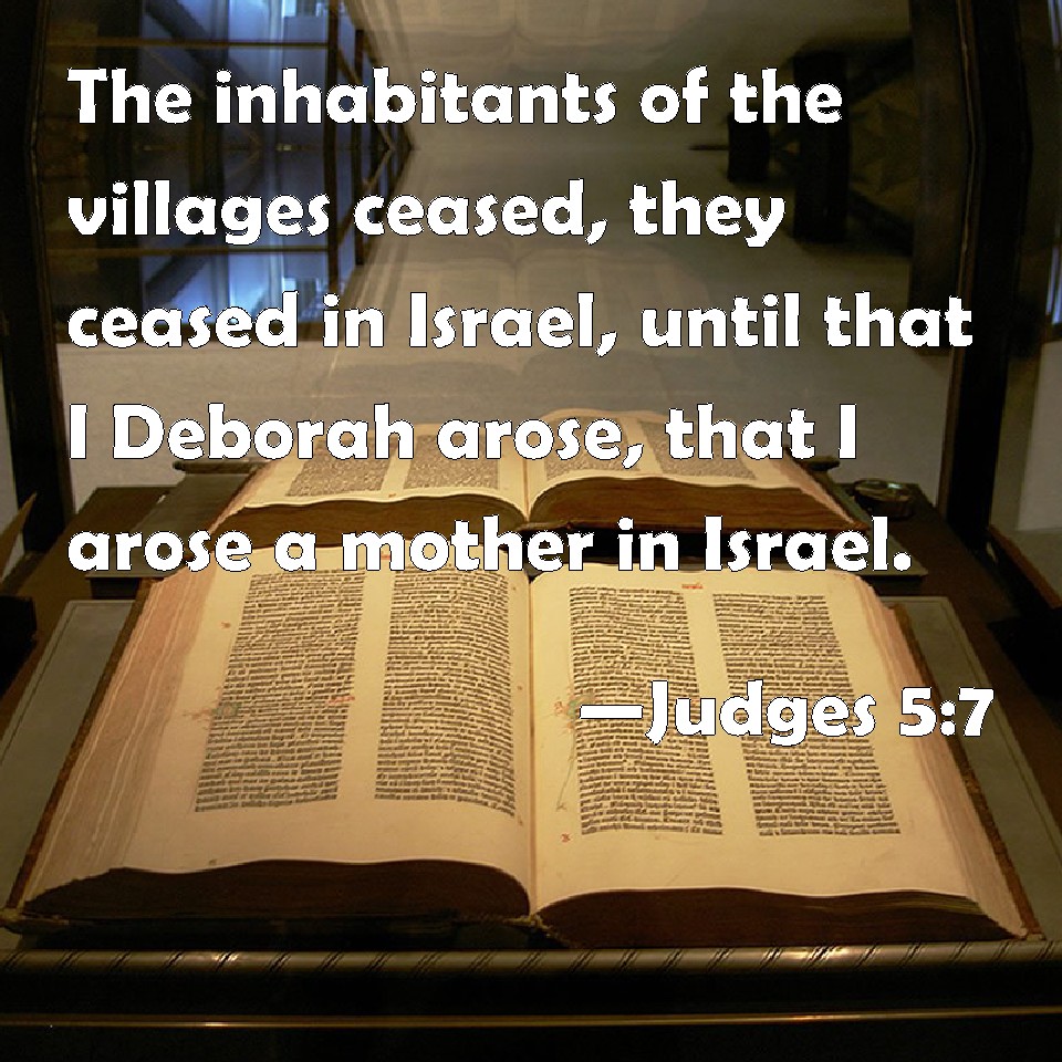 Choose a Background Judges 5:7 The inhabitants of the villages ceased, they ceased in Israel, until that I Deborah arose, that I arose a mother in Israel. KJV: The inhabitants of the villages ceased, they ceased in Israel, until that I Deborah arose, that I arose a mother in Israel. DRB: The valiant men ceased, and rested in Israel: until Debbora arose, a mother arose in Israel. DBT: The peasantry ceased in Israel, they ceased until you arose, Deb'orah, arose as a mother in Israel. ERV: The rulers ceased in Israel, they ceased, until that I Deborah arose, that I arose a mother in Israel. WBT: The inhabitants of the villages ceased, they ceased in Israel, until that I Deborah arose, that I arose a mother in Israel. WEB: The rulers ceased in Israel. They ceased until I, Deborah, arose; Until I arose a mother in Israel. YLT: Villages ceased in Israel — they ceased, Till that I arose — Deborah, That I arose, a mother in Israel.Links Judges 5:7 NIV • Judges 5:7 NLT • Judges 5:7 ESV • Judges 5:7 NASB • Judges 5:7 KJV • Judges 5:7 Interlinear • Judges 5:7 Commentaries • Judges 5:7 Parallel Texts • Judges 5:7 Bible Apps • Judges 5:7 Parallel • Bible Hub |