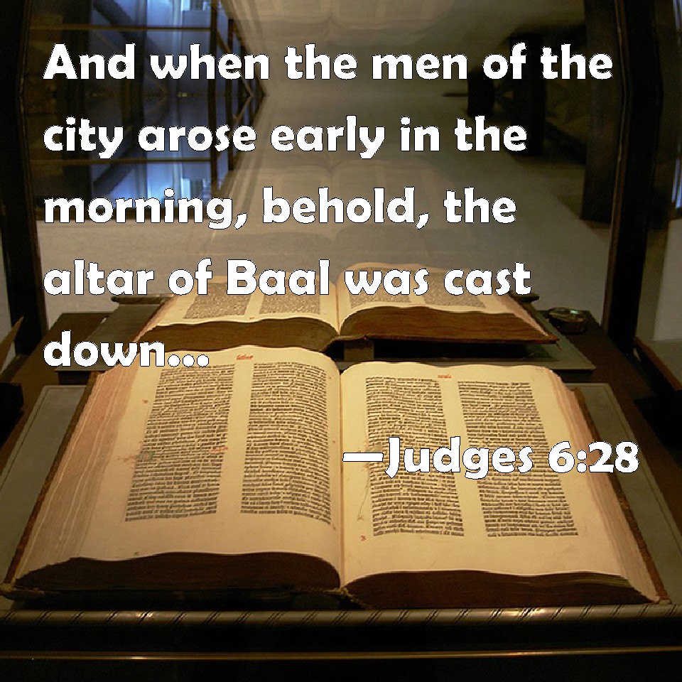 Choose a Background Judges 6:28 And when the men of the city arose early in the morning, behold, the altar of Baal was cast down, and the grove was cut down that was by it, and the second bullock was offered on the altar that was built. KJV: And when the men of the city arose early in the morning, behold, the altar of Baal was cast down, and the grove was cut down that was by it, and the second bullock was offered upon the altar that was built. DRB: And when the men of that town were risen in the morning, they saw the altar of Baal destroyed, and the grove cut down, and the second bullock laid upon the altar, which then was built. DBT: When the men of the town rose early in the morning, behold, the altar of Ba'al was broken down, and the Ashe'rah beside it was cut down, and the second bull was offered upon the altar which had been built. ERV: And when the men of the city arose early in the morning, behold, the altar of Baal was broken down, and the Asherah was cut down that was by it, and the second bullock was offered upon the altar that was built. WBT: And when the men of the city arose early in the morning, behold, the altar of Baal was cast down, and the grove was cut down that was by it, and the second bullock was offered upon the altar that was built. WEB: When the men of the city arose early in the morning, behold, the altar of Baal was broken down, and the Asherah was cut down that was by it, and the second bull was offered on the altar that was built. YLT: And the men of the city rise early in the morning, and lo, broken down hath been the altar of Baal, and the shrine which is by it hath been cut down, and the second bullock hath been offered on the altar which is built.Links Judges 6:28 NIV • Judges 6:28 NLT • Judges 6:28 ESV • Judges 6:28 NASB • Judges 6:28 KJV • Judges 6:28 Interlinear • Judges 6:28 Commentaries • Judges 6:28 Parallel Texts • Judges 6:28 Bible Apps • Judges 6:28 Parallel • Bible Hub |