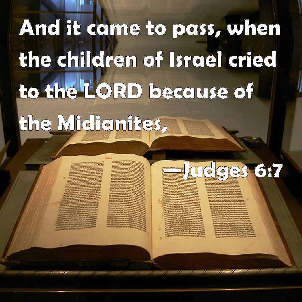 Choose a Background Judges 6:7 And it came to pass, when the children of Israel cried to the LORD because of the Midianites, KJV: And it came to pass, when the children of Israel cried unto the LORD because of the Midianites, DRB: And he cried to the Lord desiring help against the Madianites. DBT: When the people of Israel cried to the LORD on account of the Mid'ianites, ERV: And it came to pass, when the children of Israel cried unto the LORD because of Midian, WBT: And it came to pass, when the children of Israel cried to the LORD because of the Midianites, WEB: It happened, when the children of Israel cried to Yahweh because of Midian, YLT: And it cometh to pass when the sons of Israel have cried unto Jehovah, concerning Midian,Links Judges 6:7 NIV • Judges 6:7 NLT • Judges 6:7 ESV • Judges 6:7 NASB • Judges 6:7 KJV • Judges 6:7 Interlinear • Judges 6:7 Commentaries • Judges 6:7 Parallel Texts • Judges 6:7 Bible Apps • Judges 6:7 Parallel • Bible Hub |
