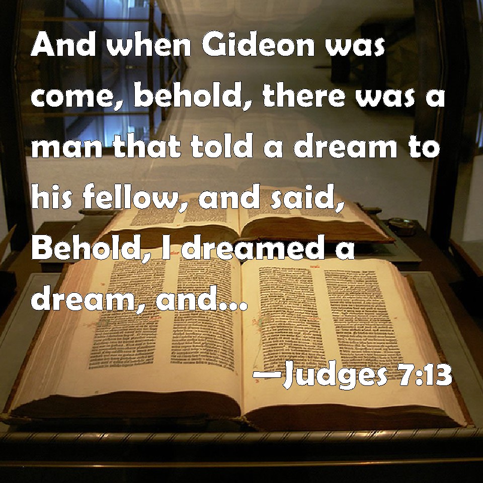 Choose a Background Judges 7:13 And when Gideon was come, behold, there was a man that told a dream to his fellow, and said, Behold, I dreamed a dream, and, see, a cake of barley bread tumbled into the host of Midian, and came to a tent, and smote it that it fell, and overturned it, that the tent lay along. KJV: And when Gideon was come, behold, there was a man that told a dream unto his fellow, and said, Behold, I dreamed a dream, and, lo, a cake of barley bread tumbled into the host of Midian, and came unto a tent, and smote it that it fell, and overturned it, that the tent lay along. DRB: And when Gedeon was come, one told his neighbour a dream: and in this manner related what he had seen: I dreamt a dream, and it seemed to me as if a hearth cake of barley bread rolled and came down into the camp of Madian: and when it was come to a tent it struck it, and beat it down flat to the ground. DBT: When Gideon came, behold, a man was telling a dream to his comrade; and he said, "Behold, I dreamed a dream; and lo, a cake of barley bread tumbled into the camp of Mid'ian, and came to the tent, and struck it so that it fell, and turned it upside down, so that the tent lay flat." ERV: And when Gideon was come, behold, there was a man that told a dream unto his fellow, and said, Behold, I dreamed a dream, and, lo, a cake of barley bread tumbled into the camp of Midian, and came unto the tent, and smote it that it fell, and turned it upside down, that the tent lay along. WBT: And when Gideon had come, behold, there was a man that told a dream to his fellow, and said, Behold, I dreamed a dream, and lo, a cake of barley-bread rolled into the host of Midian, and came to a tent, and smote it that it fell, and overturned it that the tent lay along. WEB: When Gideon had come, behold, there was a man telling a dream to his fellow; and he said, "Behold, I dreamed a dream; and behold, a cake of barley bread tumbled into the camp of Midian, and came to the tent, and struck it so that it fell, and turned it upside down, so that the tent lay flat." YLT: And Gideon cometh in, and lo, a man is recounting to his companion a dream, and saith, 'Lo, a dream I have dreamed, and lo, a cake of barley-bread is turning itself over into the camp of Midian, and it cometh in unto the tent, and smiteth it, and it falleth, and turneth it upwards, and the tent hath fallen.'Links Judges 7:13 NIV • Judges 7:13 NLT • Judges 7:13 ESV • Judges 7:13 NASB • Judges 7:13 KJV • Judges 7:13 Interlinear • Judges 7:13 Commentaries • Judges 7:13 Parallel Texts • Judges 7:13 Bible Apps • Judges 7:13 Parallel • Bible Hub |