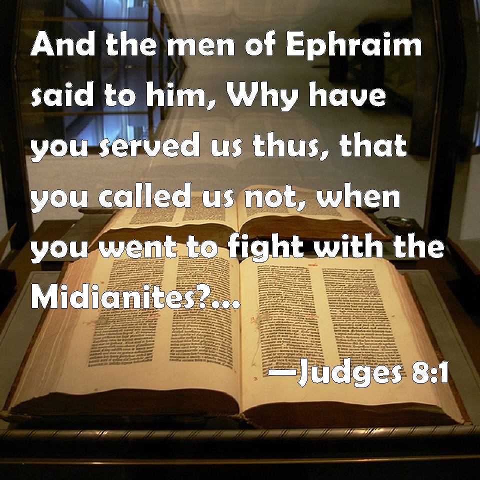 Choose a Background Judges 8:1 And the men of Ephraim said to him, Why have you served us thus, that you called us not, when you went to fight with the Midianites? And they did chide with him sharply. KJV: And the men of Ephraim said unto him, Why hast thou served us thus, that thou calledst us not, when thou wentest to fight with the Midianites? And they did chide with him sharply. DRB: And the men of Ephraim said to him: What is this that thou meanest to do, that thou wouldst not call us when thou wentest to fight against Madian? and they chid him sharply and almost offered violence. DBT: And the men of E'phraim said to him, "What is this that you have done to us, not to call us when you went to fight with Mid'ian?" And they upbraided him violently. ERV: And the men of Ephraim said unto him, Why hast thou served us thus, that thou calledst us not, when thou wentest to fight with Midian? And they did chide with him sharply. WBT: And the men of Ephraim said to him, Why hast thou treated us thus, that thou calledst us not when thou wentest to fight with the Midianites? and they chid with him sharply. WEB: The men of Ephraim said to him, "Why have you treated us this way, that you didn't call us, when you went to fight with Midian?" They rebuked him sharply. YLT: And the men of Ephraim say unto him, 'What is this thing thou hast done to us — not to call for us when thou didst go to fight with Midian?' and they strive with him severely;Links Judges 8:1 NIV • Judges 8:1 NLT • Judges 8:1 ESV • Judges 8:1 NASB • Judges 8:1 KJV • Judges 8:1 Interlinear • Judges 8:1 Commentaries • Judges 8:1 Parallel Texts • Judges 8:1 Bible Apps • Judges 8:1 Parallel • Bible Hub |