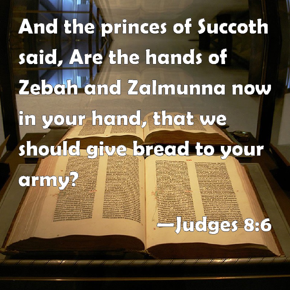 Choose a Background Judges 8:6 And the princes of Succoth said, Are the hands of Zebah and Zalmunna now in your hand, that we should give bread to your army? KJV: And the princes of Succoth said, Are the hands of Zebah and Zalmunna now in thine hand, that we should give bread unto thine army? DRB: The princes of Soccoth answered: Peradventure the palms of the hands of Zebee and Salmana are in thy hand, and therefore thou demandest that we should give bread to thy army. DBT: And the officials of Succoth said, "Are Zebah and Zalmun'na already in your hand, that we should give bread to your army?" ERV: And the princes of Succoth said, Are the hands of Zebah and Zalmunna now in thine hand, that we should give bread unto thine army? WBT: And the princes of Succoth said, Are the hands of Zebah and Zalmunna now in thy hand, that we should give bread to thy army? WEB: The princes of Succoth said, "Are the hands of Zebah and Zalmunna now in your hand, that we should give bread to your army?" YLT: And the heads of Succoth say, 'Is the hand of Zebah and Zalmunna now in thy hand, that we give to thy host bread?'Links Judges 8:6 NIV • Judges 8:6 NLT • Judges 8:6 ESV • Judges 8:6 NASB • Judges 8:6 KJV • Judges 8:6 Interlinear • Judges 8:6 Commentaries • Judges 8:6 Parallel Texts • Judges 8:6 Bible Apps • Judges 8:6 Parallel • Bible Hub |