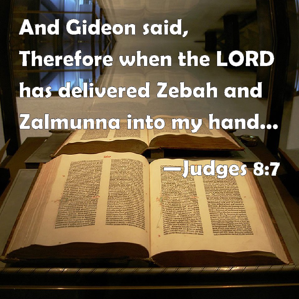 Choose a Background Judges 8:7 And Gideon said, Therefore when the LORD has delivered Zebah and Zalmunna into my hand, then I will tear your flesh with the thorns of the wilderness and with briers. KJV: And Gideon said, Therefore when the LORD hath delivered Zebah and Zalmunna into mine hand, then I will tear your flesh with the thorns of the wilderness and with briers. DRB: And he said to them: When the Lord therefore shall have delivered Zebee and Salmana into my hands, I will thresh your flesh with the thorns and briers of the desert. DBT: And Gideon said, "Well then, when the LORD has given Zebah and Zalmun'na into my hand, I will flail your flesh with the thorns of the wilderness and with briers." ERV: And Gideon said: Therefore when the LORD hath delivered Zebah and Zalmunna into mine hand, then I will tear your flesh with the thorns of the wilderness and with briers. WBT: And Gideon said, Therefore when the LORD hath delivered Zebah and Zalmunna into my hand, then I will tear your flesh with the thorns of the wilderness and with briers. WEB: Gideon said, "Therefore when Yahweh has delivered Zebah and Zalmunna into my hand, then I will tear your flesh with the thorns of the wilderness and with briers." YLT: And Gideon saith, 'Therefore — in Jehovah's giving Zebah and Zalmunna into my hand — I have threshed your flesh with the thorns of the wilderness, and with the threshing instruments.'Links Judges 8:7 NIV • Judges 8:7 NLT • Judges 8:7 ESV • Judges 8:7 NASB • Judges 8:7 KJV • Judges 8:7 Interlinear • Judges 8:7 Commentaries • Judges 8:7 Parallel Texts • Judges 8:7 Bible Apps • Judges 8:7 Parallel • Bible Hub |