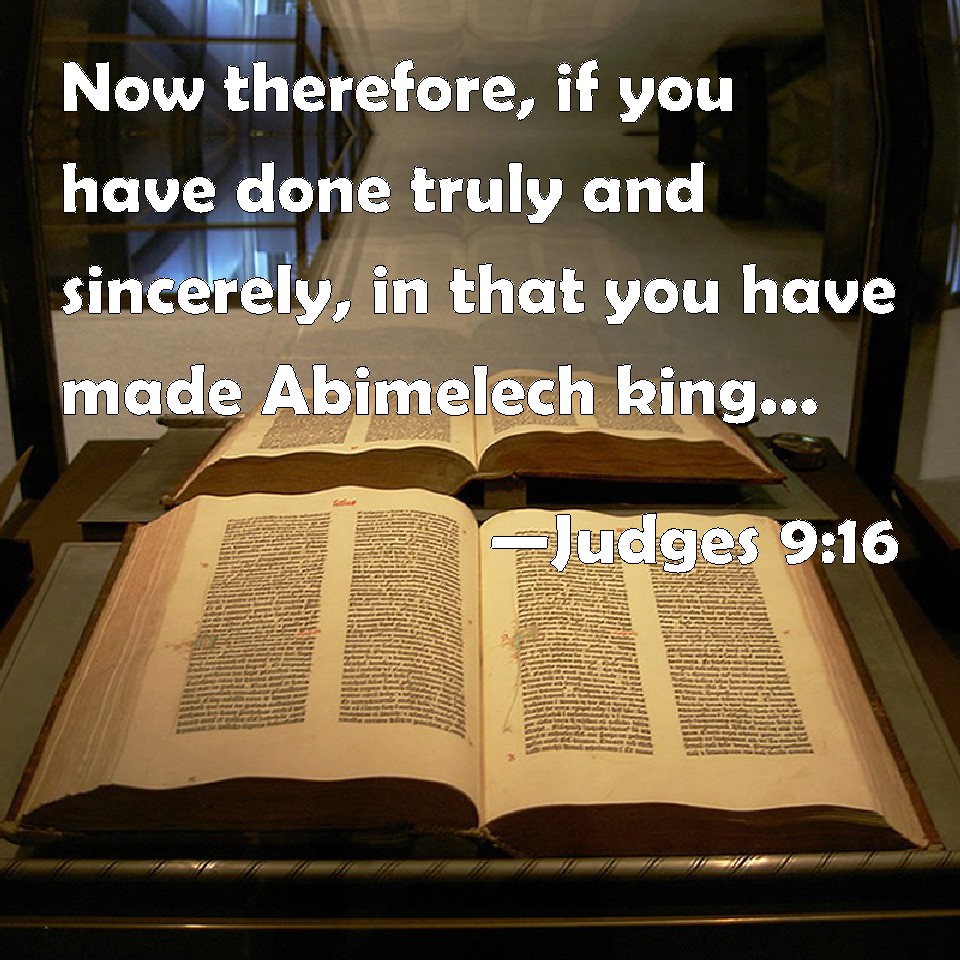Choose a Background Judges 9:16 Now therefore, if you have done truly and sincerely, in that you have made Abimelech king, and if you have dealt well with Jerubbaal and his house, and have done to him according to the deserving of his hands; KJV: Now therefore, if ye have done truly and sincerely, in that ye have made Abimelech king, and if ye have dealt well with Jerubbaal and his house, and have done unto him according to the deserving of his hands; DRB: Now therefore if you have done well, and without sin in appointing Abimelech king over you, and have dealt well with Jerobaal, and with his house, and have made a suitable return for the benefits of him, who fought for you, DBT: "Now therefore, if you acted in good faith and honor when you made Abim'elech king, and if you have dealt well with Jerubba'al and his house, and have done to him as his deeds deserved— ERV: Now therefore, if ye have dealt truly and uprightly, in that ye have made Abimelech king, and if ye have dealt well with Jerubbaal and his house, and have done unto him according to the deserving of his hands; WBT: Now therefore, if ye have done truly and sincerely, in that ye have made Abimelech king, and if ye have dealt well with Jerubbaal and his house, and have done to him according to the deserving of his hands: WEB: "Now therefore, if you have dealt truly and righteously, in that you have made Abimelech king, and if you have dealt well with Jerubbaal and his house, and have done to him according to the deserving of his hands YLT: And, now, if in truth and in sincerity ye have acted, when ye make Abimelech king; and if ye have done good with Jerubbaal, and with his house; and if according to the deed of his hands ye have done to him — Links Judges 9:16 NIV • Judges 9:16 NLT • Judges 9:16 ESV • Judges 9:16 NASB • Judges 9:16 KJV • Judges 9:16 Interlinear • Judges 9:16 Commentaries • Judges 9:16 Parallel Texts • Judges 9:16 Bible Apps • Judges 9:16 Parallel • Bible Hub |