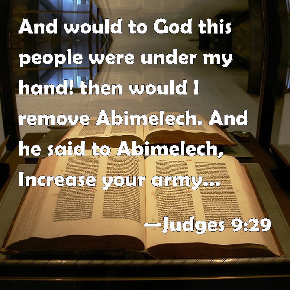 Choose a Background Judges 9:29 And would to God this people were under my hand! then would I remove Abimelech. And he said to Abimelech, Increase your army, and come out. KJV: And would to God this people were under my hand! then would I remove Abimelech. And he said to Abimelech, Increase thine army, and come out. DRB: Would to God that some man would put this people under my hand, that I might remove Abimelech out of the way. And it was said to Abimelech: Gather together the multitude of an army, and come. DBT: Would that this people were under my hand! then I would remove Abim'elech. I would say to Abim'elech, 'Increase your army, and come out.'" ERV: And would to God this people were under my hand! then would I remove Abimelech. And he said to Abimelech, Increase thine army, and come out. WBT: And would that this people were under my hand! then would I remove Abimelech. And he said to Abimelech, Increase thy army, and come out. WEB: Would that this people were under my hand! Then I would remove Abimelech." He said to Abimelech, "Increase your army, and come out!" YLT: and oh that this people were in my hand — then I turn Abimelech aside;' and he saith to Abimelech, 'Increase thy host, and come out.'Links Judges 9:29 NIV • Judges 9:29 NLT • Judges 9:29 ESV • Judges 9:29 NASB • Judges 9:29 KJV • Judges 9:29 Interlinear • Judges 9:29 Commentaries • Judges 9:29 Parallel Texts • Judges 9:29 Bible Apps • Judges 9:29 Parallel • Bible Hub |