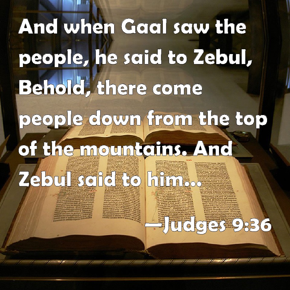 Choose a Background Judges 9:36 And when Gaal saw the people, he said to Zebul, Behold, there come people down from the top of the mountains. And Zebul said to him, You see the shadow of the mountains as if they were men. KJV: And when Gaal saw the people, he said to Zebul, Behold, there come people down from the top of the mountains. And Zebul said unto him, Thou seest the shadow of the mountains as if they were men. DRB: And when Gaal saw the people, he said to Zebul: Behold a multitude cometh down from the mountains. And he answered him: Thou seest the shadows of the mountains as if they were the heads of men, and this is thy mistake. DBT: And when Ga'al saw the men, he said to Zebul, "Look, men are coming down from the mountain tops!" And Zebul said to him, "You see the shadow of the mountains as if they were men." ERV: And when Gaal saw the people, he said to Zebul, Behold, there come people down from the tops of the mountains. And Zebul said unto him, Thou seest the shadow of the mountains as if they were men. WBT: And when Gaal saw the people, he said to Zebul, Behold, there come people down from the top of the mountains. And Zebul said to him, Thou seest the shadow of the mountains as if they were men. WEB: When Gaal saw the people, he said to Zebul, "Behold, people are coming down from the tops of the mountains." Zebul said to him, "You see the shadow of the mountains as if they were men." YLT: and Gaal seeth the people, and saith unto Zebul, 'Lo, people are coming down from the top of the hills;' and Zebul saith unto him, 'The shadow of the hills thou art seeing like men.'Links Judges 9:36 NIV • Judges 9:36 NLT • Judges 9:36 ESV • Judges 9:36 NASB • Judges 9:36 KJV • Judges 9:36 Interlinear • Judges 9:36 Commentaries • Judges 9:36 Parallel Texts • Judges 9:36 Bible Apps • Judges 9:36 Parallel • Bible Hub |