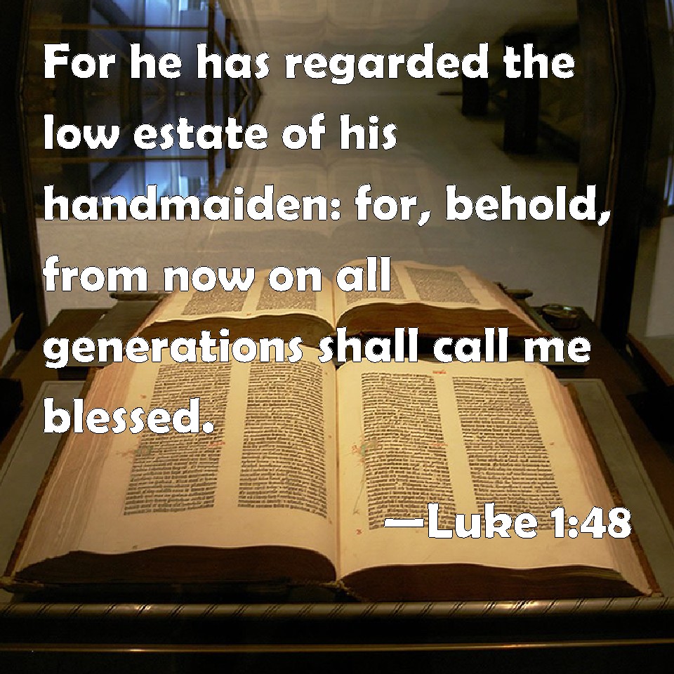 Choose a Background Luke 1:48 For he has regarded the low estate of his handmaiden: for, behold, from now on all generations shall call me blessed. KJV: For he hath regarded the low estate of his handmaiden: for, behold, from henceforth all generations shall call me blessed. DRB: Because he hath regarded the humility of his handmaid; for behold from henceforth all generations shall call me blessed. DBT: For he has looked upon the low estate of his bondmaid; for behold, from henceforth all generations shall call me blessed. ERV: For he hath looked upon the low estate of his handmaiden: For behold, from henceforth all generations shall call me blessed. WBT: For he hath regarded the low estate of his handmaiden: for behold, from henceforth all generations will call me blessed. WEB: for he has looked at the humble state of his handmaid. For behold, from now on, all generations will call me blessed. YLT: Because He looked on the lowliness of His maid-servant, For, lo, henceforth call me happy shall all the generations,Links Luke 1:48 NIV • Luke 1:48 NLT • Luke 1:48 ESV • Luke 1:48 NASB • Luke 1:48 KJV • Luke 1:48 Interlinear • Luke 1:48 Commentaries • Luke 1:48 Parallel Texts • Luke 1:48 Bible Apps • Luke 1:48 Parallel • Bible Hub |