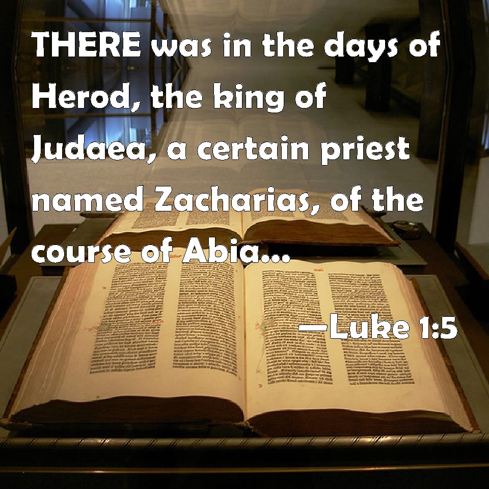 Choose a Background Luke 1:5 THERE was in the days of Herod, the king of Judaea, a certain priest named Zacharias, of the course of Abia: and his wife was of the daughters of Aaron, and her name was Elisabeth. KJV: There was in the days of Herod, the king of Judaea, a certain priest named Zacharias, of the course of Abia: and his wife was of the daughters of Aaron, and her name was Elisabeth. DRB: There was in the days of Herod, the king of Judea, a certain priest named Zachary, of the course of Abia; and his wife was of the daughters of Aaron, and her name Elizabeth. DBT: There was in the days of Herod, the king of Judaea, a certain priest, by name Zacharias, of the course of Abia, and his wife of the daughters of Aaron, and her name Elizabeth. ERV: There was in the days of Herod, king of Judaea, a certain priest named Zacharias, of the course of Abijah: and he had a wife of the daughters of Aaron, and her name was Elisabeth. WBT: There was in the days of Herod the king of Judea, a certain priest named Zacharias, of the course of Abia: and his wife was of the daughters of Aaron, and her name was Elisabeth. WEB: There was in the days of Herod, the king of Judea, a certain priest named Zacharias, of the priestly division of Abijah. He had a wife of the daughters of Aaron, and her name was Elizabeth. YLT: There was in the days of Herod, the king of Judea, a certain priest, by name Zacharias, of the course of Abijah, and his wife of the daughters of Aaron, and her name Elisabeth;Links Luke 1:5 NIV • Luke 1:5 NLT • Luke 1:5 ESV • Luke 1:5 NASB • Luke 1:5 KJV • Luke 1:5 Interlinear • Luke 1:5 Commentaries • Luke 1:5 Parallel Texts • Luke 1:5 Bible Apps • Luke 1:5 Parallel • Bible Hub |