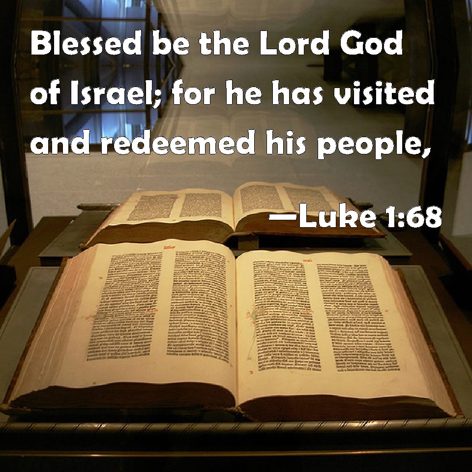 Choose a Background Luke 1:68 Blessed be the Lord God of Israel; for he has visited and redeemed his people, KJV: Blessed be the Lord God of Israel; for he hath visited and redeemed his people, DRB: Blessed be the Lord God of Israel; because he hath visited and wrought the redemption of his people: DBT: Blessed be the Lord the God of Israel, because he has visited and wrought redemption for his people, ERV: Blessed be the Lord, the God of Israel; For he hath visited and wrought redemption for his people, WBT: Blessed be the Lord God of Israel; for he hath visited and redeemed his people. WEB: "Blessed be the Lord, the God of Israel, for he has visited and worked redemption for his people; YLT: Blessed is the Lord, the God of Israel, Because He did look upon, And wrought redemption for His people,Links Luke 1:68 NIV • Luke 1:68 NLT • Luke 1:68 ESV • Luke 1:68 NASB • Luke 1:68 KJV • Luke 1:68 Interlinear • Luke 1:68 Commentaries • Luke 1:68 Parallel Texts • Luke 1:68 Bible Apps • Luke 1:68 Parallel • Bible Hub |