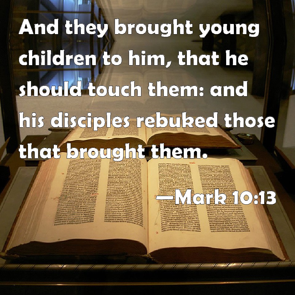Choose a Background Mark 10:13 And they brought young children to him, that he should touch them: and his disciples rebuked those that brought them. KJV: And they brought young children to him, that he should touch them: and his disciples rebuked those that brought them. DRB: And they brought to him young children, that he might touch them. And the disciples rebuked them that brought them. DBT: And they brought little children to him that he might touch them. But the disciples rebuked those that brought them. ERV: And they brought unto him little children, that he should touch them: and the disciples rebuked them. WBT: And they brought young children to him, that he should touch them; and his disciples rebuked those that brought them. WEB: They were bringing to him little children, that he should touch them, but the disciples rebuked those who were bringing them. YLT: And they were bringing to him children, that he might touch them, and the disciples were rebuking those bringing them,Links Mark 10:13 NIV • Mark 10:13 NLT • Mark 10:13 ESV • Mark 10:13 NASB • Mark 10:13 KJV • Mark 10:13 Interlinear • Mark 10:13 Commentaries • Mark 10:13 Parallel Texts • Mark 10:13 Bible Apps • Mark 10:13 Parallel • Bible Hub |