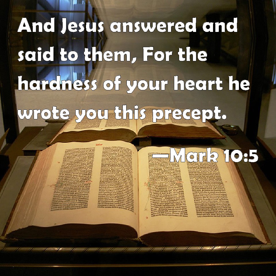 Choose a Background Mark 10:5 And Jesus answered and said to them, For the hardness of your heart he wrote you this precept. KJV: And Jesus answered and said unto them, For the hardness of your heart he wrote you this precept. DRB: To whom Jesus answering, said: Because of the hardness of your heart he wrote you that precept. DBT: And Jesus answering said to them, In view of your hard-heartedness he wrote this commandment for you; ERV: But Jesus said unto them, For your hardness of heart he wrote you this commandment. WBT: And Jesus answered and said to them, For the hardness of your heart, he wrote you this precept. WEB: But Jesus said to them, "For your hardness of heart, he wrote you this commandment. YLT: And Jesus answering said to them, 'For the stiffness of your heart he wrote you this command,Links Mark 10:5 NIV • Mark 10:5 NLT • Mark 10:5 ESV • Mark 10:5 NASB • Mark 10:5 KJV • Mark 10:5 Interlinear • Mark 10:5 Commentaries • Mark 10:5 Parallel Texts • Mark 10:5 Bible Apps • Mark 10:5 Parallel • Bible Hub |