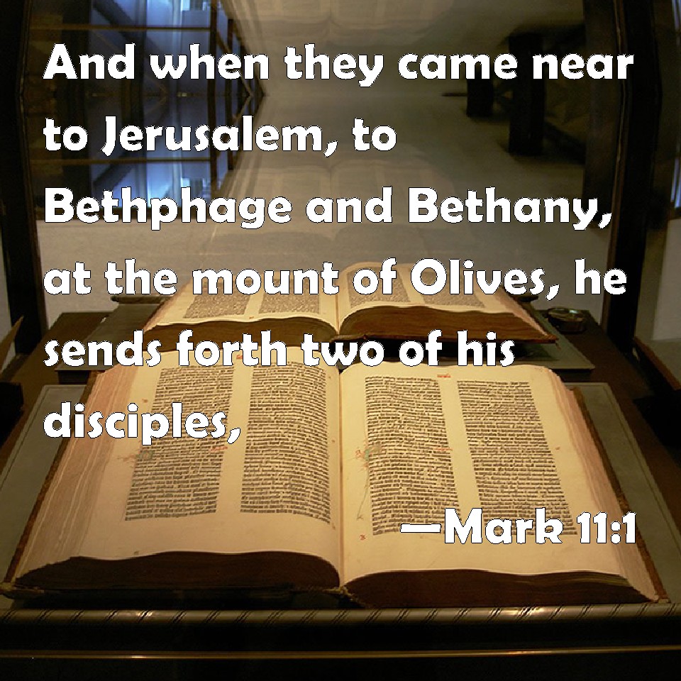 Choose a Background Mark 11:1 And when they came near to Jerusalem, to Bethphage and Bethany, at the mount of Olives, he sends forth two of his disciples, KJV: And when they came nigh to Jerusalem, unto Bethphage and Bethany, at the mount of Olives, he sendeth forth two of his disciples, DRB: AND when they were drawing near to Jerusalem and to Bethania at the mount of Olives, he sendeth two of his disciples, DBT: And when they draw near to Jerusalem, to Bethphage and Bethany, at the mount of Olives, he sends two of his disciples, ERV: And when they draw nigh unto Jerusalem, unto Bethphage and Bethany, at the mount of Olives, he sendeth two of his disciples, WBT: And when they came nigh to Jerusalem, to Bethphage, and Bethany, at the mount of Olives, he sendeth forth two of his disciples, WEB: When they drew near to Jerusalem, to Bethsphage and Bethany, at the Mount of Olives, he sent two of his disciples, YLT: And when they come nigh to Jerusalem, to Bethphage, and Bethany, unto the mount of the Olives, he sendeth forth two of his disciples,Links Mark 11:1 NIV • Mark 11:1 NLT • Mark 11:1 ESV • Mark 11:1 NASB • Mark 11:1 KJV • Mark 11:1 Interlinear • Mark 11:1 Commentaries • Mark 11:1 Parallel Texts • Mark 11:1 Bible Apps • Mark 11:1 Parallel • Bible Hub |