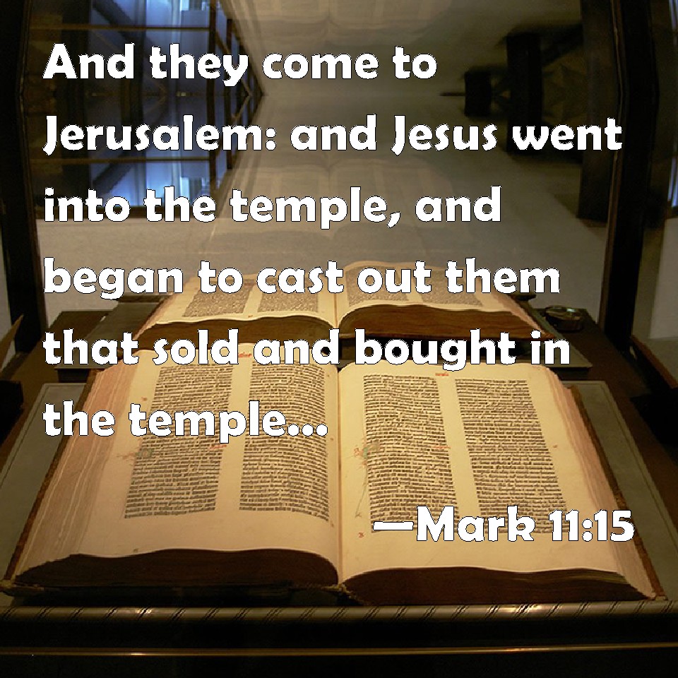 Choose a Background Mark 11:15 And they come to Jerusalem: and Jesus went into the temple, and began to cast out them that sold and bought in the temple, and overthrew the tables of the moneychangers, and the seats of them that sold doves; KJV: And they come to Jerusalem: and Jesus went into the temple, and began to cast out them that sold and bought in the temple, and overthrew the tables of the moneychangers, and the seats of them that sold doves; DRB: And they came to Jerusalem. And when he was entered into the temple, he began to cast out them that sold and bought in the temple, and overthrew the tables of the moneychangers, and the chairs of them that sold doves. DBT: And they come to Jerusalem, and entering into the temple, he began to cast out those who sold and who bought in the temple, and he overthrew the tables of the moneychangers and the seats of the dove-sellers, ERV: And they come to Jerusalem: and he entered into the temple, and began to cast out them that sold and them that bought in the temple, and overthrew the tables of the money-changers, and the seats of them that sold the doves; WBT: And they come to Jerusalem: and Jesus went into the temple, and began to cast out them that sold and bought in the temple, and overthrew the tables of the money-changers, and the seats of them that sold doves; WEB: They came to Jerusalem, and Jesus entered into the temple, and began to throw out those who sold and those who bought in the temple, and overthrew the tables of the money changers, and the seats of those who sold the doves. YLT: And they come to Jerusalem, and Jesus having gone into the temple, began to cast forth those selling and buying in the temple, and the tables of the money-changers and the seats of those selling the doves, he overthrew,Links Mark 11:15 NIV • Mark 11:15 NLT • Mark 11:15 ESV • Mark 11:15 NASB • Mark 11:15 KJV • Mark 11:15 Interlinear • Mark 11:15 Commentaries • Mark 11:15 Parallel Texts • Mark 11:15 Bible Apps • Mark 11:15 Parallel • Bible Hub |
