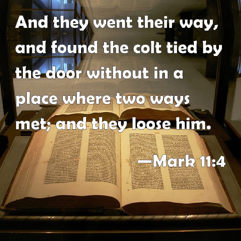 Choose a Background Mark 11:4 And they went their way, and found the colt tied by the door without in a place where two ways met; and they loose him. KJV: And they went their way, and found the colt tied by the door without in a place where two ways met; and they loose him. DRB: And going their way, they found the colt tied before the gate without, in the meeting of two ways: and they loose him. DBT: And they departed, and found a colt bound to the door without at the crossway, and they loose him. ERV: And they went away, and found a colt tied at the door without in the open street; and they loose him. WBT: And they went, and found the colt tied by the door without, in a place where two ways met; and they loose him. WEB: They went away, and found a young donkey tied at the door outside in the open street, and they untied him. YLT: And they went away, and found the colt tied at the door without, by the two ways, and they loose it,Links Mark 11:4 NIV • Mark 11:4 NLT • Mark 11:4 ESV • Mark 11:4 NASB • Mark 11:4 KJV • Mark 11:4 Interlinear • Mark 11:4 Commentaries • Mark 11:4 Parallel Texts • Mark 11:4 Bible Apps • Mark 11:4 Parallel • Bible Hub |