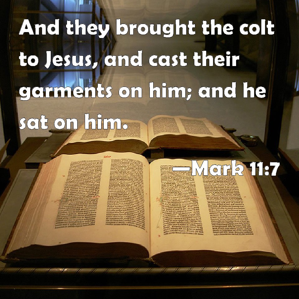 Choose a Background Mark 11:7 And they brought the colt to Jesus, and cast their garments on him; and he sat on him. KJV: And they brought the colt to Jesus, and cast their garments on him; and he sat upon him. DRB: And they brought the colt to Jesus; and they lay their garments on him, and he sat upon him. DBT: And they led the colt to Jesus, and cast their clothes upon it, and he sat on it; ERV: And they bring the colt unto Jesus, and cast on him their garments; and he sat upon him. WBT: And they brought the colt to Jesus, and cast their garments on him; and he sat upon him. WEB: They brought the young donkey to Jesus, and threw their garments on it, and Jesus sat on it. YLT: And they brought the colt unto Jesus, and did cast upon it their garments, and he sat upon it,Links Mark 11:7 NIV • Mark 11:7 NLT • Mark 11:7 ESV • Mark 11:7 NASB • Mark 11:7 KJV • Mark 11:7 Interlinear • Mark 11:7 Commentaries • Mark 11:7 Parallel Texts • Mark 11:7 Bible Apps • Mark 11:7 Parallel • Bible Hub |