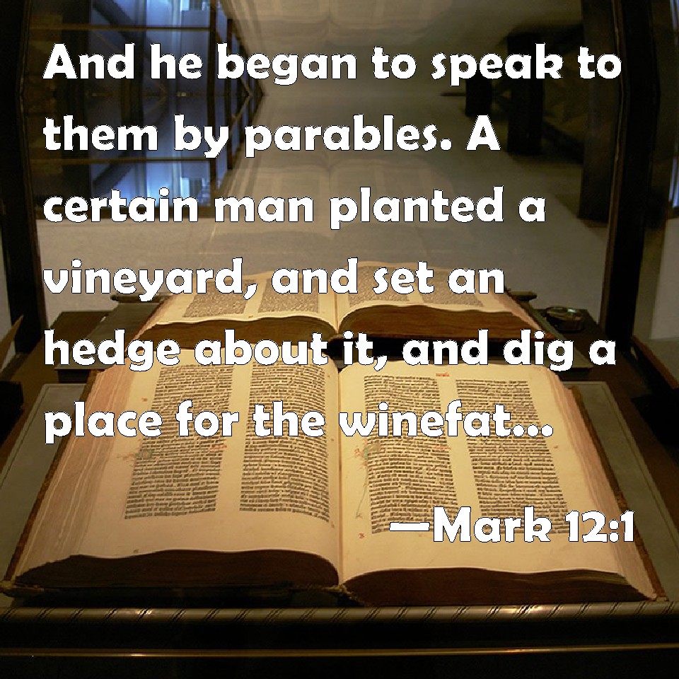 Choose a Background Mark 12:1 And he began to speak to them by parables. A certain man planted a vineyard, and set an hedge about it, and dig a place for the winefat, and built a tower, and let it out to farmers, and went into a far country. KJV: And he began to speak unto them by parables. A certain man planted a vineyard, and set an hedge about it, and digged a place for the winefat, and built a tower, and let it out to husbandmen, and went into a far country. DRB: AND he began to speak to them in parables: A certain man planted a vineyard and made a hedge about it, and dug a place for the winefat, and built a tower, and let it to husbandmen; and went into a far country. DBT: And he began to say to them in parables, A man planted a vineyard, and made a fence round it and dug a wine-vat, and built a tower, and let it out to husbandmen, and left the country. ERV: And he began to speak unto them in parables. A man planted a vineyard, and set a hedge about it, and digged a pit for the winepress, and built a tower, and let it out to husbandmen, and went into another country. WBT: And he began to speak to them by parables. A certain man planted a vineyard, and set a hedge about it, and digged a place for the wine-vat, and built a tower, and let it out to husbandmen, and went into a far country. WEB: He began to speak to them in parables. "A man planted a vineyard, put a hedge around it, dug a pit for the winepress, built a tower, rented it out to a farmer, and went into another country. YLT: And he began to speak to them in similes: 'A man planted a vineyard, and put a hedge around, and digged an under-wine-vat, and built a tower, and gave it out to husbandmen, and went abroad;Links Mark 12:1 NIV • Mark 12:1 NLT • Mark 12:1 ESV • Mark 12:1 NASB • Mark 12:1 KJV • Mark 12:1 Interlinear • Mark 12:1 Commentaries • Mark 12:1 Parallel Texts • Mark 12:1 Bible Apps • Mark 12:1 Parallel • Bible Hub |