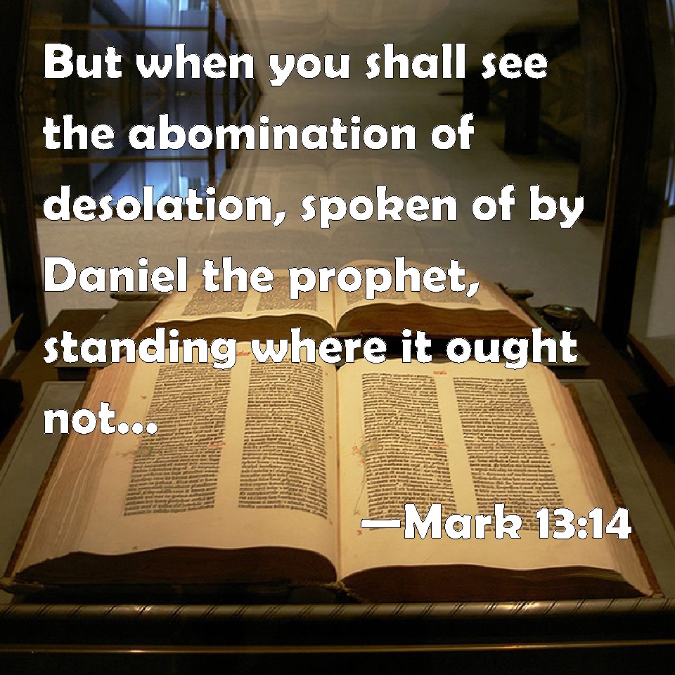 Choose a Background Mark 13:14 But when you shall see the abomination of desolation, spoken of by Daniel the prophet, standing where it ought not, (let him that reads understand,) then let them that be in Judaea flee to the mountains: KJV: But when ye shall see the abomination of desolation, spoken of by Daniel the prophet, standing where it ought not, (let him that readeth understand,) then let them that be in Judaea flee to the mountains: DRB: And when you shall see the abomination of desolation, standing where it ought not: he that readeth let him understand: then let them that are in Judea, flee unto the mountains: DBT: But when ye shall see the abomination of desolation standing where it should not, (he that reads let him consider it,) then let those in Judaea flee to the mountains; ERV: But when ye see the abomination of desolation standing where he ought not (let him that readeth understand), then let them that are in Judaea flee unto the mountains: WBT: But when ye shall see the abomination of desolation, spoken of by Daniel the prophet, standing where it ought not, (let him that readeth understand) then let them that are in Judea flee to the mountains: WEB: But when you see the abomination of desolation, spoken of by Daniel the prophet, standing where it ought not (let the reader understand), then let those who are in Judea flee to the mountains, YLT: 'And when ye may see the abomination of the desolation, that was spoken of by Daniel the prophet, standing where it ought not, (whoever is reading let him understand), then those in Judea, let them flee to the mountains;Links Mark 13:14 NIV • Mark 13:14 NLT • Mark 13:14 ESV • Mark 13:14 NASB • Mark 13:14 KJV • Mark 13:14 Interlinear • Mark 13:14 Commentaries • Mark 13:14 Parallel Texts • Mark 13:14 Bible Apps • Mark 13:14 Parallel • Bible Hub |