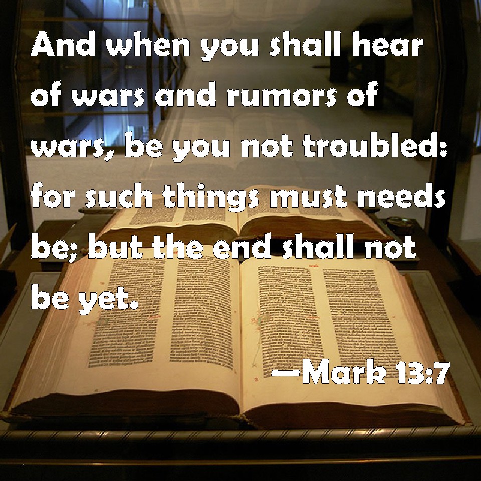 Choose a Background Mark 13:7 And when you shall hear of wars and rumors of wars, be you not troubled: for such things must needs be; but the end shall not be yet. KJV: And when ye shall hear of wars and rumours of wars, be ye not troubled: for such things must needs be; but the end shall not be yet. DRB: And when you shall hear of wars and rumours of wars, fear ye not. For such things must needs be, but the end is not yet. DBT: But when ye shall hear of wars and rumours of wars, be not disturbed, for this must happen, but the end is not yet. ERV: And when ye shall hear of wars and rumours of wars, be not troubled: these things must needs come to pass; but the end is not yet. WBT: And when ye shall hear of wars, and rumors of wars, be ye not troubled: for such things must needs be; but the end will not be yet. WEB: "When you hear of wars and rumors of wars, don't be troubled. For those must happen, but the end is not yet. YLT: and when ye may hear of wars and reports of wars, be not troubled, for these behove to be, but the end is not yet;Links Mark 13:7 NIV • Mark 13:7 NLT • Mark 13:7 ESV • Mark 13:7 NASB • Mark 13:7 KJV • Mark 13:7 Interlinear • Mark 13:7 Commentaries • Mark 13:7 Parallel Texts • Mark 13:7 Bible Apps • Mark 13:7 Parallel • Bible Hub |