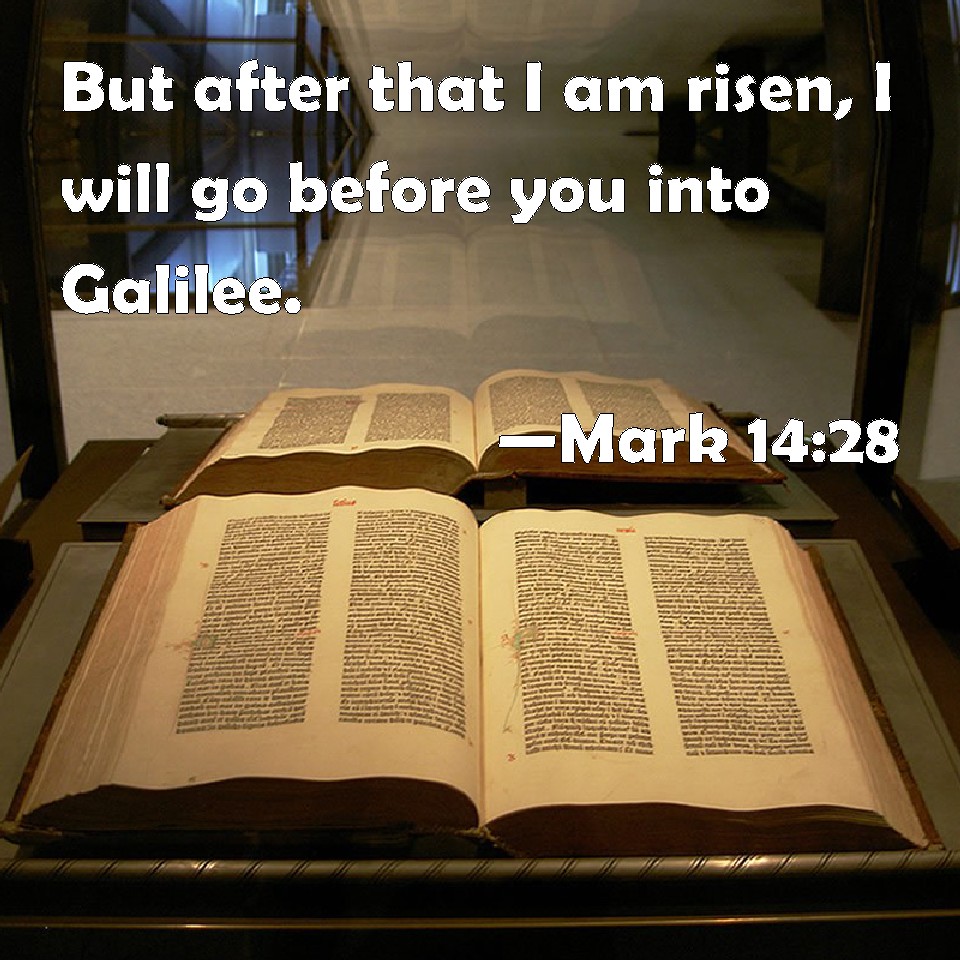 Mark 14:28 But after that I am risen, I will go before you into Galilee.