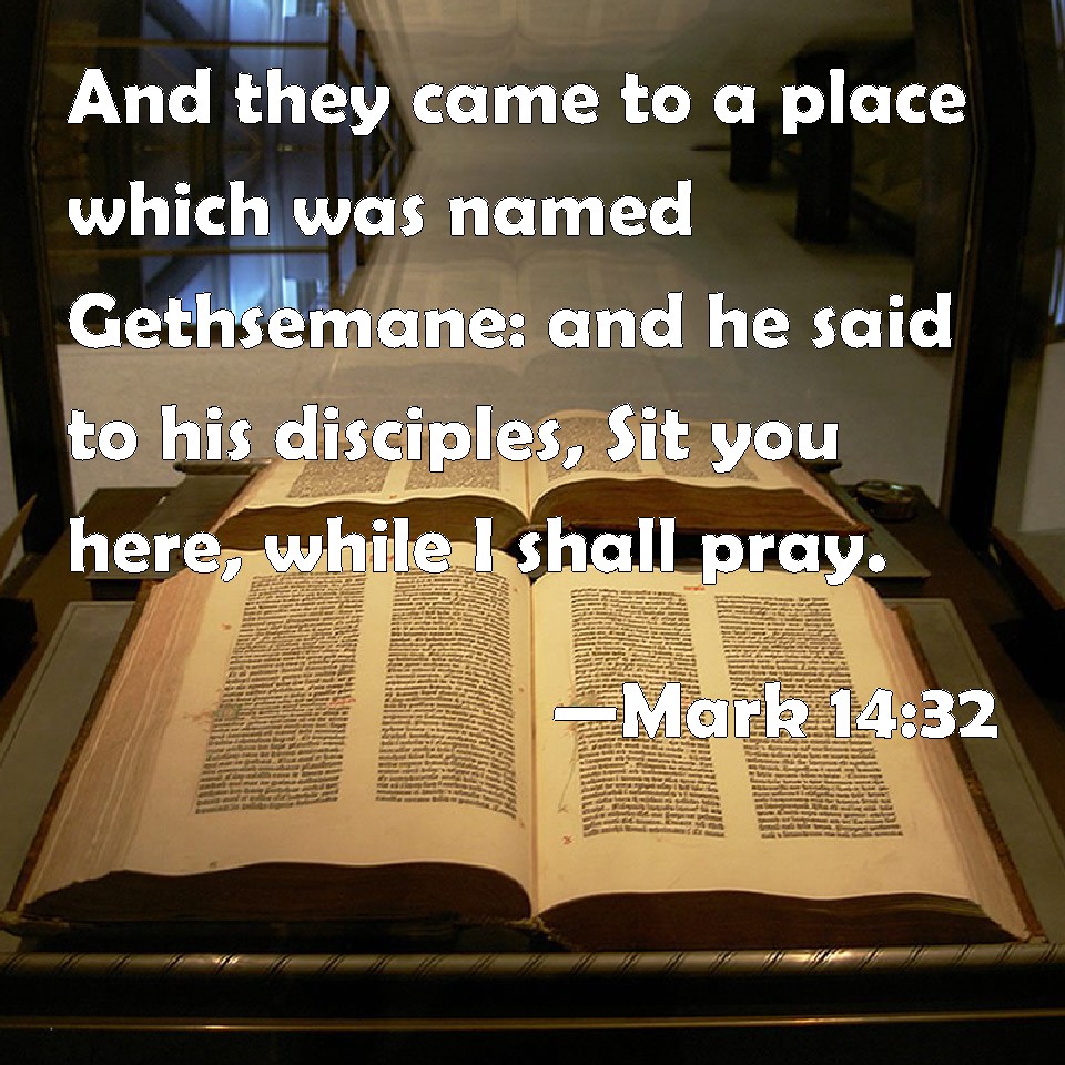 Choose a Background Mark 14:32 And they came to a place which was named Gethsemane: and he said to his disciples, Sit you here, while I shall pray. KJV: And they came to a place which was named Gethsemane: and he saith to his disciples, Sit ye here, while I shall pray. DRB: And they came to a farm called Gethsemani. And he saith to his disciples: Sit you here, while I pray. DBT: And they come to a place of which the name is Gethsemane, and he says to his disciples, Sit here while I shall pray. ERV: And they come unto a place which was named Gethsemane: and he saith unto his disciples, Sit ye here, while I pray. WBT: And they came to a place which was named Gethsemane: and he saith to his disciples, Sit ye here, while I shall pray. WEB: They came to a place which was named Gethsemane. He said to his disciples, "Sit here, while I pray." YLT: And they come to a spot, the name of which is Gethsemane, and he saith to his disciples, 'Sit ye here till I may pray;'Links Mark 14:32 NIV • Mark 14:32 NLT • Mark 14:32 ESV • Mark 14:32 NASB • Mark 14:32 KJV • Mark 14:32 Interlinear • Mark 14:32 Commentaries • Mark 14:32 Parallel Texts • Mark 14:32 Bible Apps • Mark 14:32 Parallel • Bible Hub |