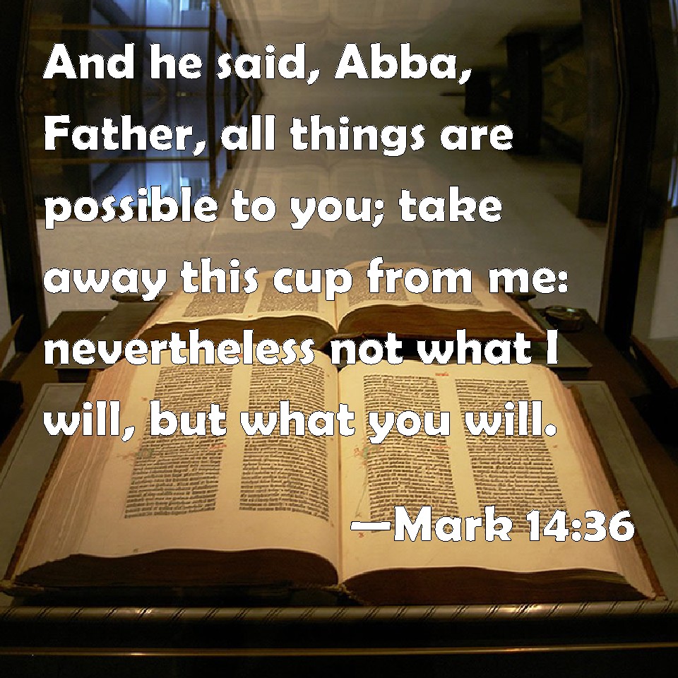 Choose a Background Mark 14:36 And he said, Abba, Father, all things are possible to you; take away this cup from me: nevertheless not what I will, but what you will. KJV: And he said, Abba, Father, all things are possible unto thee; take away this cup from me: nevertheless not what I will, but what thou wilt. DRB: And he saith: Abba, Father, all things are possible to thee: remove this chalice from me; but not what I will, but what thou wilt. DBT: And he said, Abba, Father, all things are possible to thee: take away this cup from me; but not what I will, but what thou wilt. ERV: And he said, Abba, Father, all things are possible unto thee; remove this cup from me: howbeit not what I will, but what thou wilt. WBT: And he said, Abba, Father, all things are possible to thee; take away this cup from me: nevertheless, not what I will, but what thou wilt. WEB: He said, "Abba, Father, all things are possible to you. Please remove this cup from me. However, not what I desire, but what you desire." YLT: and he said, 'Abba, Father; all things are possible to Thee; make this cup pass from me; but, not what I will, but what Thou.'Links Mark 14:36 NIV • Mark 14:36 NLT • Mark 14:36 ESV • Mark 14:36 NASB • Mark 14:36 KJV • Mark 14:36 Interlinear • Mark 14:36 Commentaries • Mark 14:36 Parallel Texts • Mark 14:36 Bible Apps • Mark 14:36 Parallel • Bible Hub |