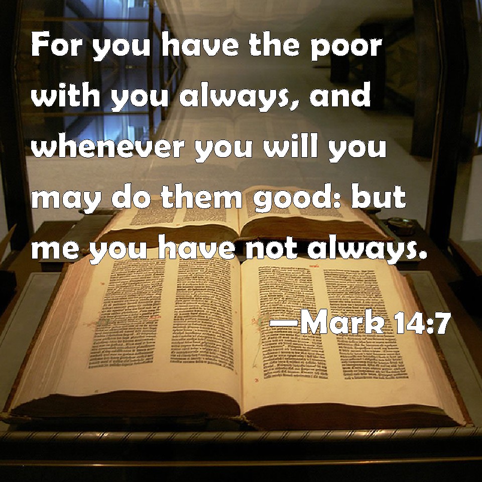 Choose a Background Mark 14:7 For you have the poor with you always, and whenever you will you may do them good: but me you have not always. KJV: For ye have the poor with you always, and whensoever ye will ye may do them good: but me ye have not always. DRB: For the poor you have always with you: and whensoever you will, you may do them good: but me you have not always. DBT: for ye have the poor always with you, and whenever ye would ye can do them good; but me ye have not always. ERV: For ye have the poor always with you, and whensoever ye will ye can do them good: but me ye have not always. WBT: For ye have the poor with you always, and whenever ye will ye may do them good: but me ye have not always. WEB: For you always have the poor with you, and whenever you want to, you can do them good; but you will not always have me. YLT: for the poor always ye have with you, and whenever ye may will ye are able to do them good, but me ye have not always;Links Mark 14:7 NIV • Mark 14:7 NLT • Mark 14:7 ESV • Mark 14:7 NASB • Mark 14:7 KJV • Mark 14:7 Interlinear • Mark 14:7 Commentaries • Mark 14:7 Parallel Texts • Mark 14:7 Bible Apps • Mark 14:7 Parallel • Bible Hub |