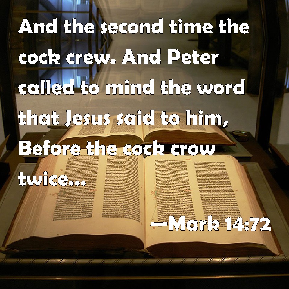 Choose a Background Mark 14:72 And the second time the cock crew. And Peter called to mind the word that Jesus said to him, Before the cock crow twice, you shall deny me thrice. And when he thought thereon, he wept. KJV: And the second time the cock crew. And Peter called to mind the word that Jesus said unto him, Before the cock crow twice, thou shalt deny me thrice. And when he thought thereon, he wept. DRB: And immediately the cock crew again. And Peter remembered the word that Jesus had said unto him: Before the cock crow twice, thou shalt thrice deny me. And he began to weep. DBT: And the second time a cock crew. And Peter remembered the word that Jesus said to him, Before the cock crow twice, thou shalt deny me thrice; and when he thought thereon he wept. ERV: And straightway the second time the cock crew. And Peter called to mind the word, how that Jesus said unto him, Before the cock crow twice, thou shalt deny me thrice. And when he thought thereon, he wept. WBT: And the second time the cock crowed. And Peter called to mind the word that Jesus said to him, Before the cock shall crow twice, thou wilt deny me thrice. And when he thought thereon, he wept. WEB: The rooster crowed the second time. Peter remembered the word, how that Jesus said to him, "Before the rooster crows twice, you will deny me three times." When he thought about that, he wept. YLT: and a second time a cock crew, and Peter remembered the saying that Jesus said to him — 'Before a cock crow twice, thou mayest deny me thrice;' and having thought thereon — he was weeping.Links Mark 14:72 NIV • Mark 14:72 NLT • Mark 14:72 ESV • Mark 14:72 NASB • Mark 14:72 KJV • Mark 14:72 Interlinear • Mark 14:72 Commentaries • Mark 14:72 Parallel Texts • Mark 14:72 Bible Apps • Mark 14:72 Parallel • Bible Hub |