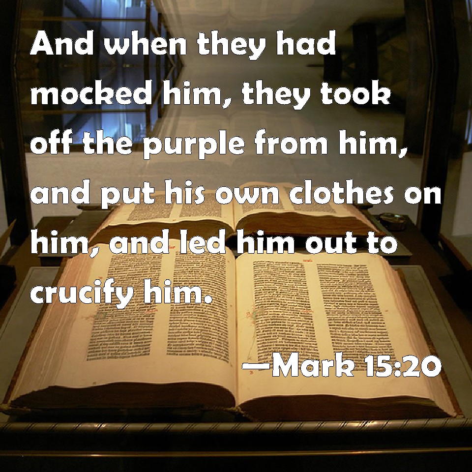 Choose a Background Mark 15:20 And when they had mocked him, they took off the purple from him, and put his own clothes on him, and led him out to crucify him. KJV: And when they had mocked him, they took off the purple from him, and put his own clothes on him, and led him out to crucify him. DRB: And after they had mocked him, they took off the purple from him, and put his own garments on him, and they led him out to crucify him. DBT: And when they had mocked him, they took the purple off him, and put his own clothes on him; and they lead him out that they may crucify him. ERV: And when they had mocked him, they took off from him the purple, and put on him his garments. And they lead him out to crucify him. WBT: And when they had mocked him, they took off the purple from him, and put his own clothes on him, and led him out to crucify him. WEB: When they had mocked him, they took the purple off of him, and put his own garments on him. They led him out to crucify him. YLT: and when they had mocked him, they took the purple from off him, and clothed him in his own garments, and they led him forth, that they may crucify him.Links Mark 15:20 NIV • Mark 15:20 NLT • Mark 15:20 ESV • Mark 15:20 NASB • Mark 15:20 KJV • Mark 15:20 Interlinear • Mark 15:20 Commentaries • Mark 15:20 Parallel Texts • Mark 15:20 Bible Apps • Mark 15:20 Parallel • Bible Hub |