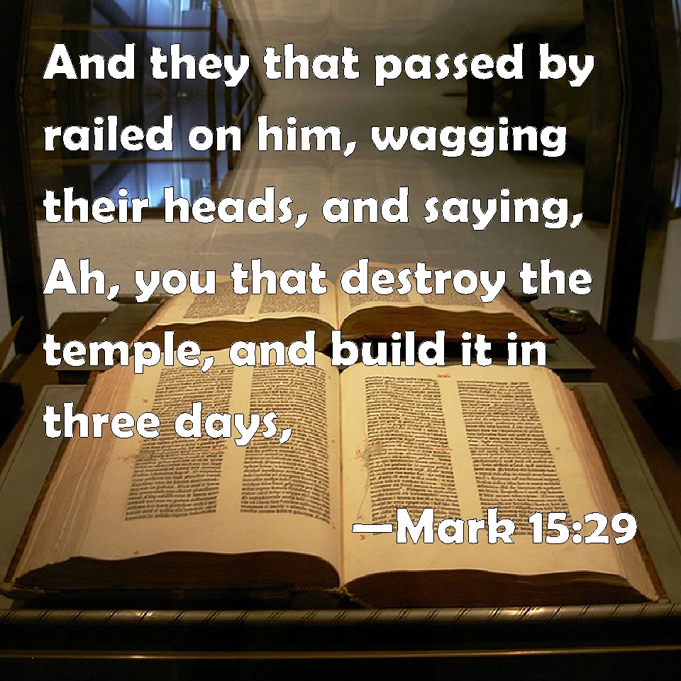 Choose a Background Mark 15:29 And they that passed by railed on him, wagging their heads, and saying, Ah, you that destroy the temple, and build it in three days, KJV: And they that passed by railed on him, wagging their heads, and saying, Ah, thou that destroyest the temple, and buildest it in three days, DRB: And they that passed by blasphemed him, wagging their heads, and saying: Vah, thou that destroyest the temple of God, and in three days buildest it up again; DBT: And they that passed by reviled him, shaking their heads, and saying, Aha, thou that destroyest the temple and buildest it in three days, ERV: And they that passed by railed on him, wagging their heads, and saying, Ha! thou that destroyest the temple, and buildest it in three days, WBT: And they that passed by, railed on him, wagging their heads, and saying, Ah, thou that destroyest the temple, and buildest it in three days, WEB: Those who passed by blasphemed him, wagging their heads, and saying, "Ha! You who destroy the temple, and build it in three days, YLT: And those passing by were speaking evil of him, shaking their heads, and saying, 'Ah, the thrower down of the sanctuary, and in three days the builder!Links Mark 15:29 NIV • Mark 15:29 NLT • Mark 15:29 ESV • Mark 15:29 NASB • Mark 15:29 KJV • Mark 15:29 Interlinear • Mark 15:29 Commentaries • Mark 15:29 Parallel Texts • Mark 15:29 Bible Apps • Mark 15:29 Parallel • Bible Hub |