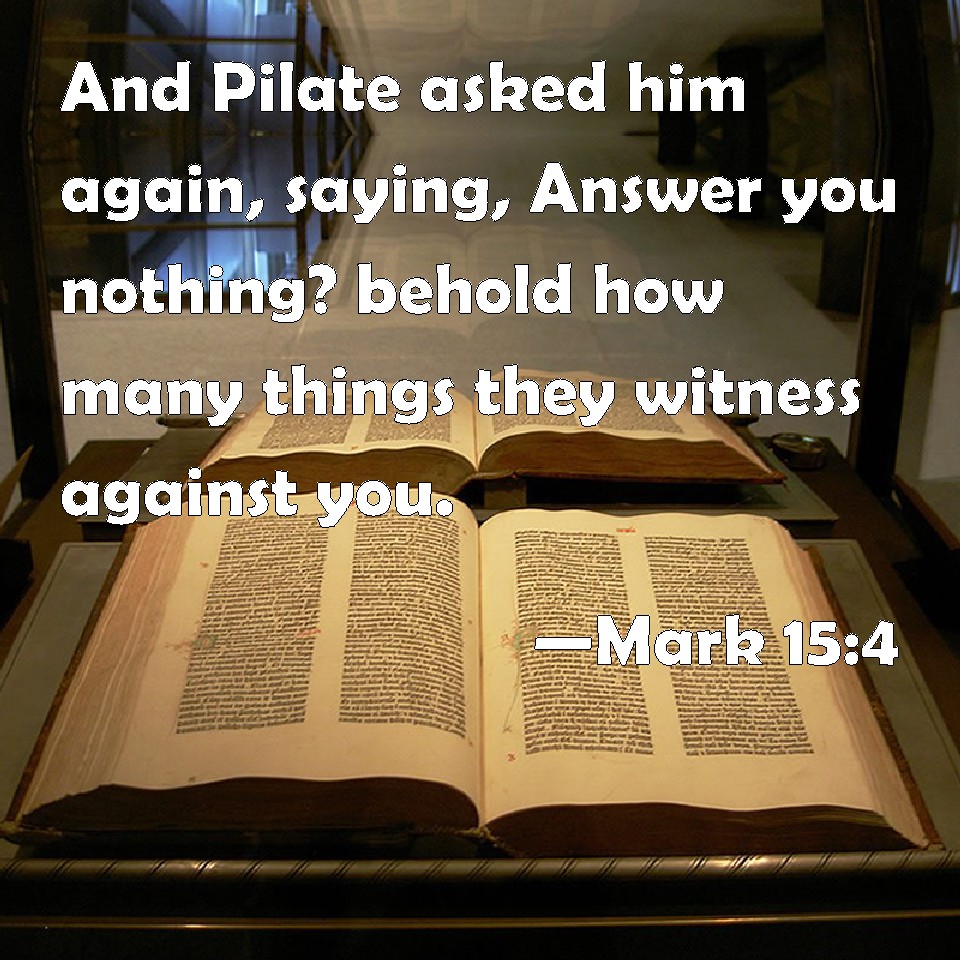 Choose a Background Mark 15:4 And Pilate asked him again, saying, Answer you nothing? behold how many things they witness against you. KJV: And Pilate asked him again, saying, Answerest thou nothing? behold how many things they witness against thee. DRB: And Pilate again asked him, saying: Answerest thou nothing? behold in how many things they accuse thee. DBT: And Pilate asked him again, saying, Answerest thou nothing? See of how many things they bear witness against thee. ERV: And Pilate again asked him, saying, Answerest thou nothing? behold how many things they accuse thee of. WBT: And Pilate asked him again, saying, Answerest thou nothing? behold how many things they testify against thee. WEB: Pilate again asked him, "Have you no answer? See how many things they testify against you!" YLT: And Pilate again questioned him, saying, 'Thou dost not answer anything! lo, how many things they do testify against thee!'Links Mark 15:4 NIV • Mark 15:4 NLT • Mark 15:4 ESV • Mark 15:4 NASB • Mark 15:4 KJV • Mark 15:4 Interlinear • Mark 15:4 Commentaries • Mark 15:4 Parallel Texts • Mark 15:4 Bible Apps • Mark 15:4 Parallel • Bible Hub |